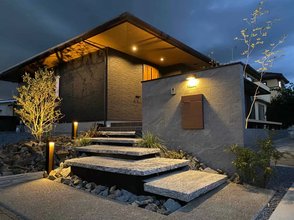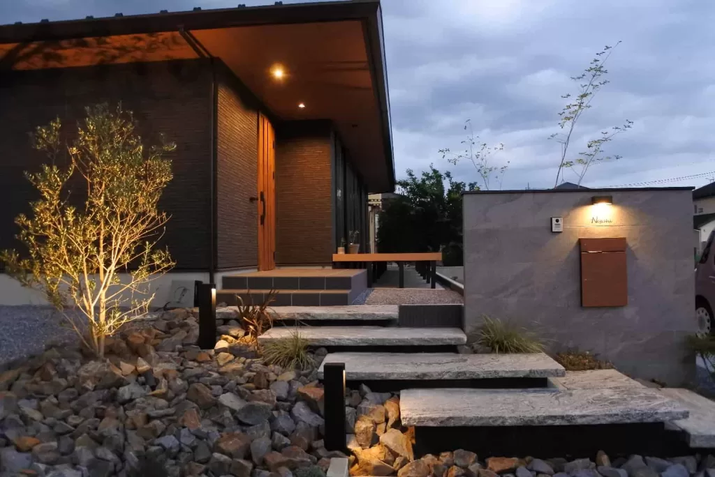 浮遊感のあるステップと緑豊かな植栽たちが心地よく玄関へ誘導してくれる自然の風合いに満ちたおしゃれな外構に仕上がりました。