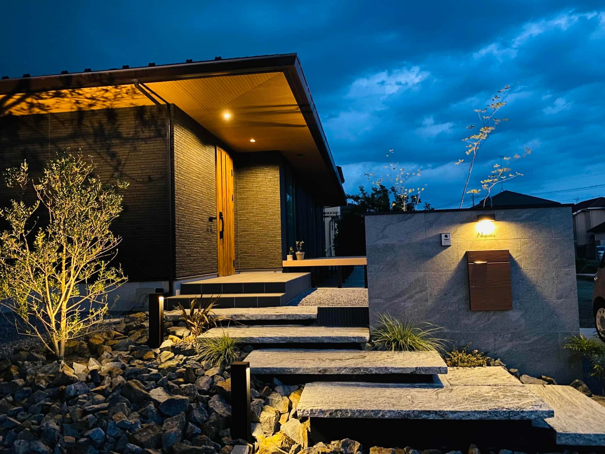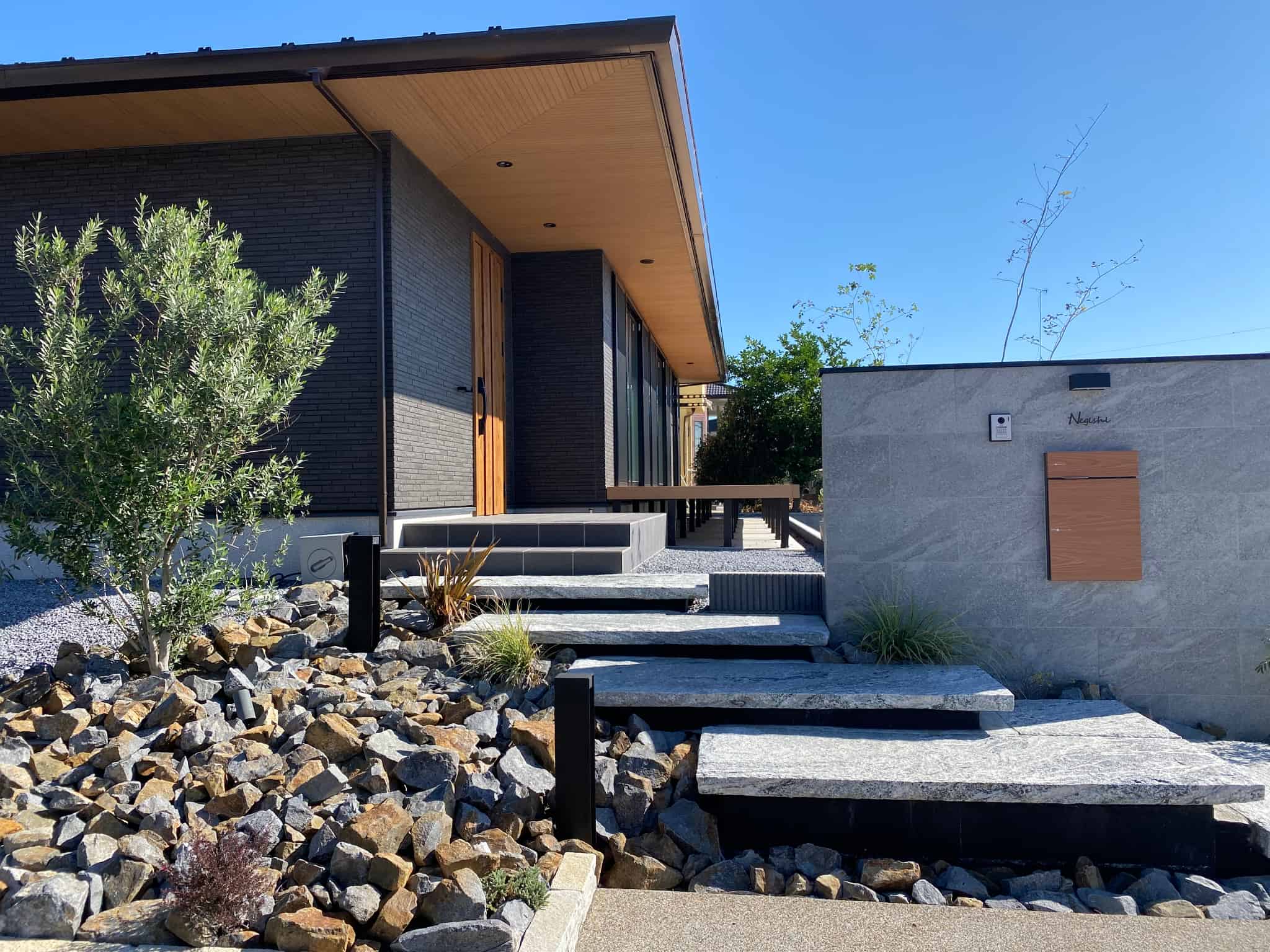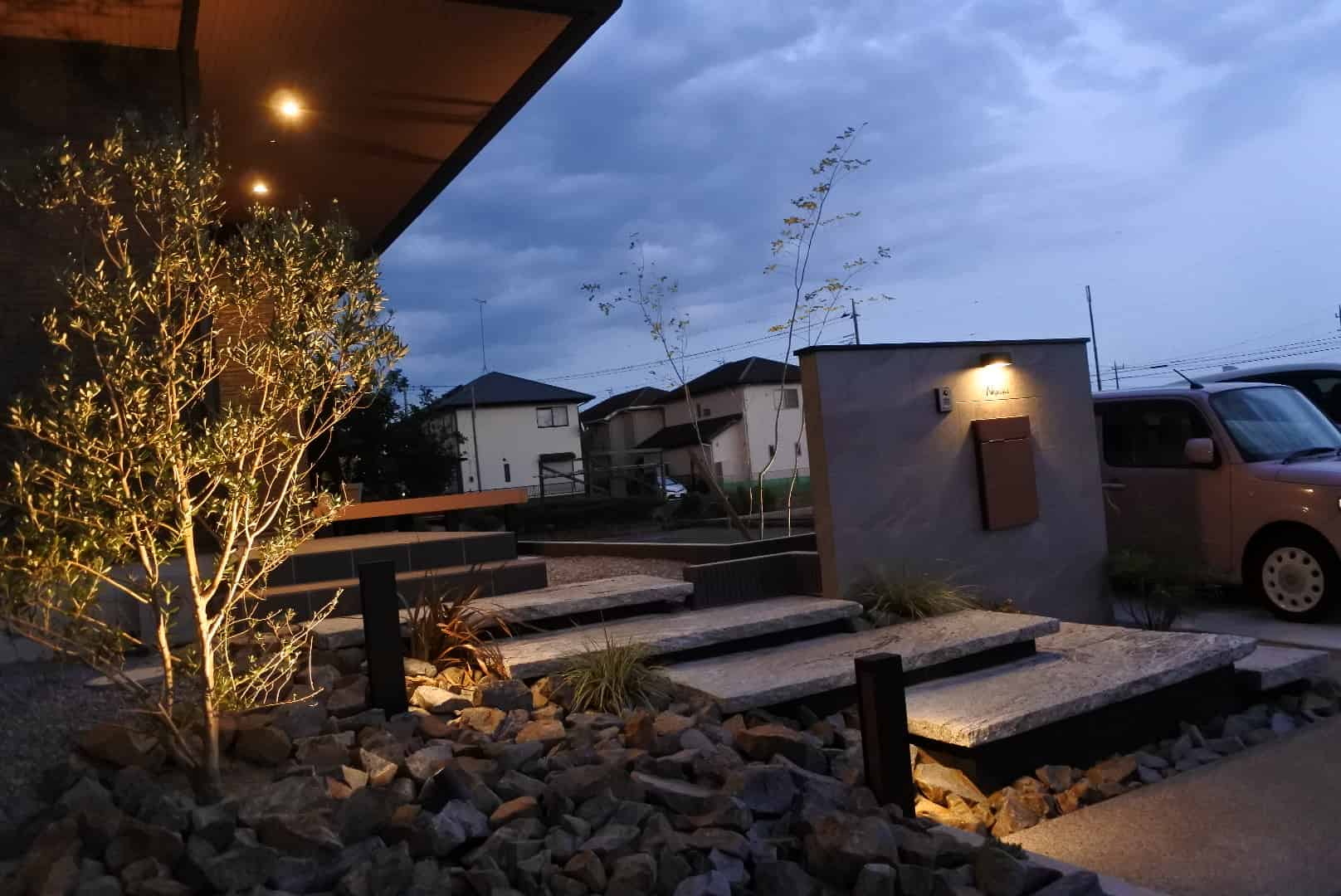 浮遊感のあるステップと緑豊かな植栽たちが心地よく玄関へ誘導してくれる自然の風合いに満ちたおしゃれな外構に仕上がりました。
