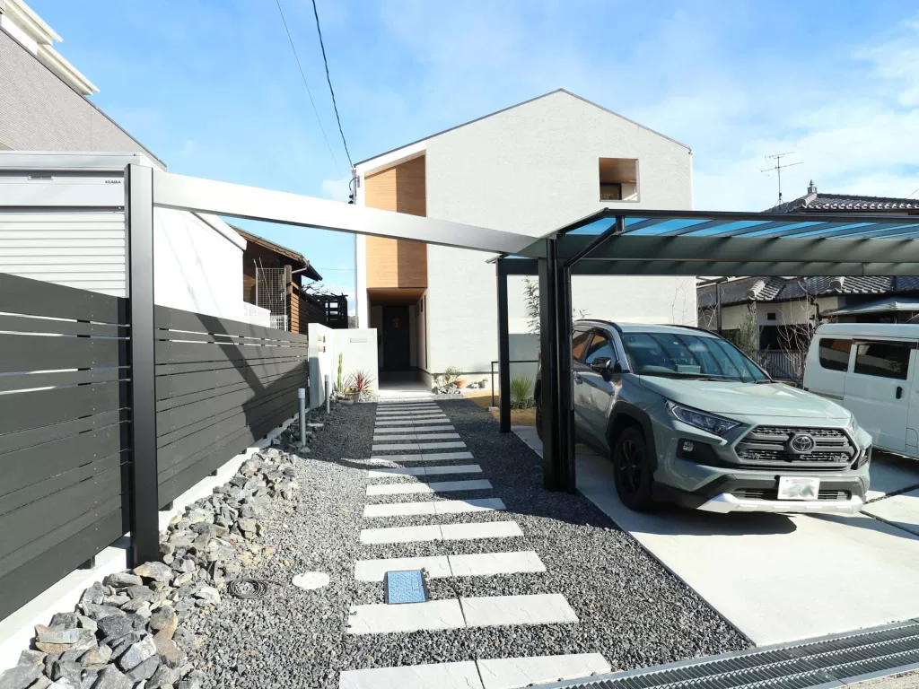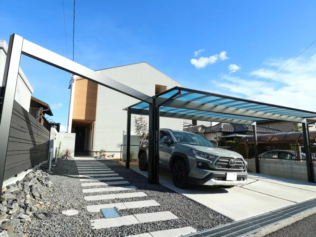 カーポートは、三協アルミのスカイリードでシンプルながらも存在感のあるデザインが特徴的です。