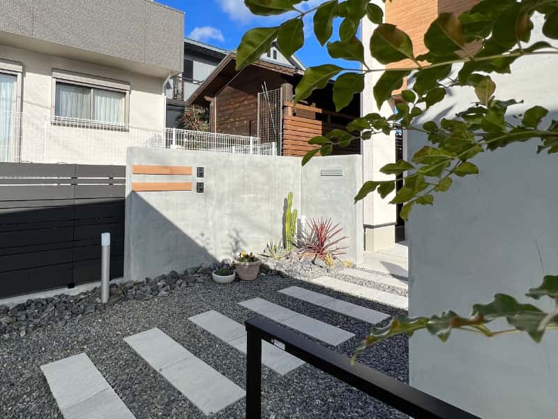 アプローチ部分には、三協アルミのMグローリアを採用し、ゲートを設置することで外構の雰囲気が変わりました。