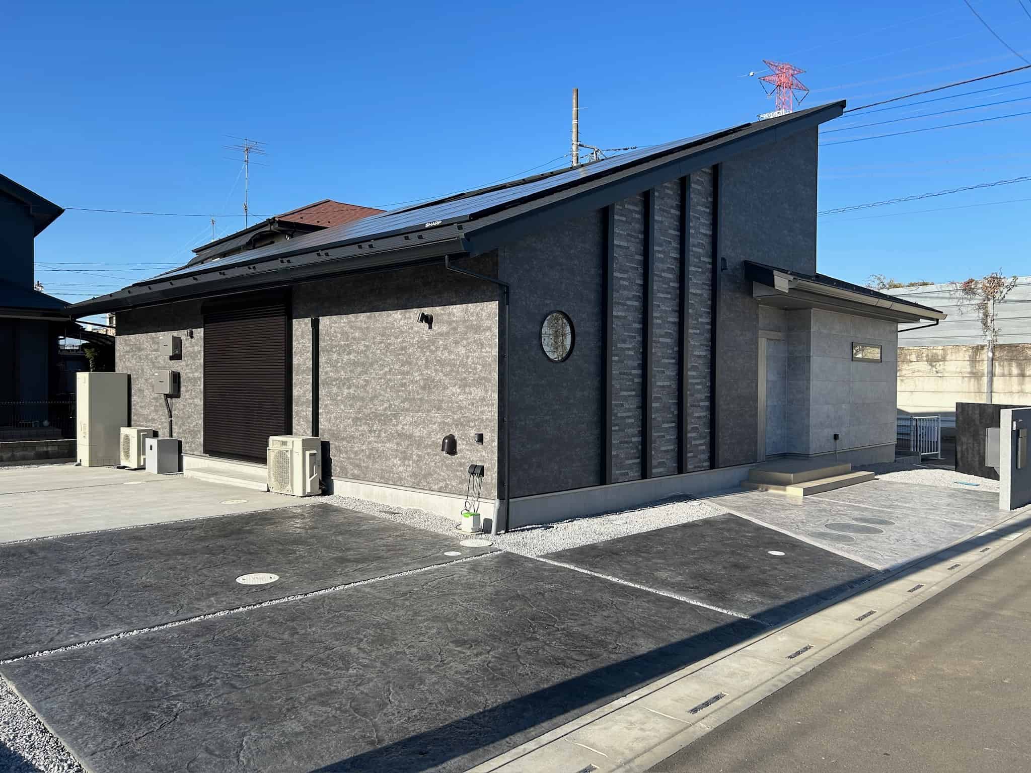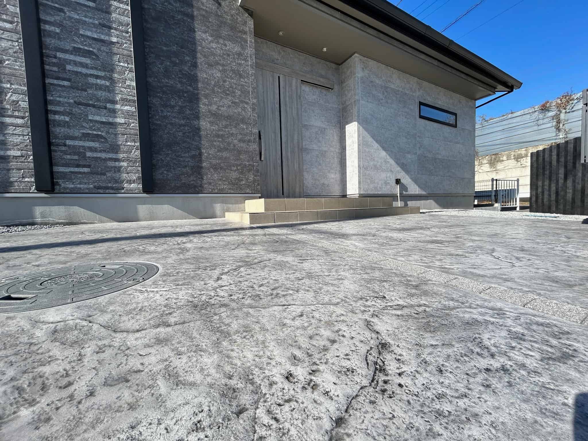 特に、オリジナルのコンクリート素材「タイヤNo痕」と「崖プレーン」を組み合わせた土間は、外壁との調和が美しく、奥行きのある空間を創出しています。