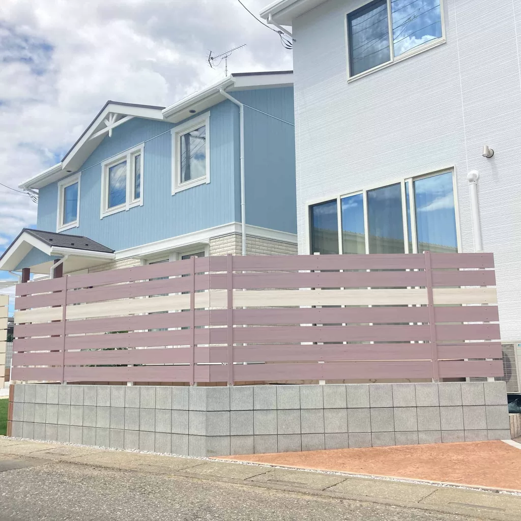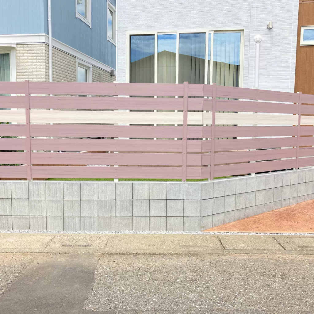 デザインガーデンオリジナルのくすみピンクのフェンスは、可愛らしいピンク色でありながら、くすみカラーなので落ち着いた印象を与え、お家のデザインとも見事に調和しています。