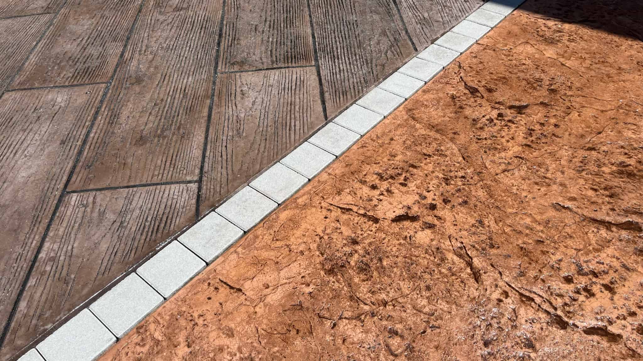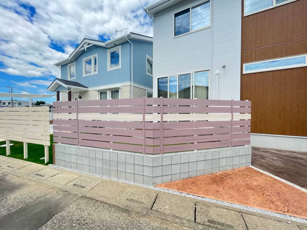 特に、くすみピンクのフェンスとブラウン系のスタンプコンクリートの組み合わせは、統一感のあるおしゃれな空間を演出しています。