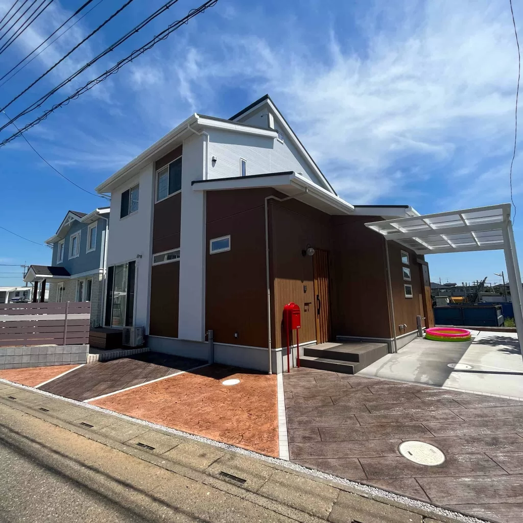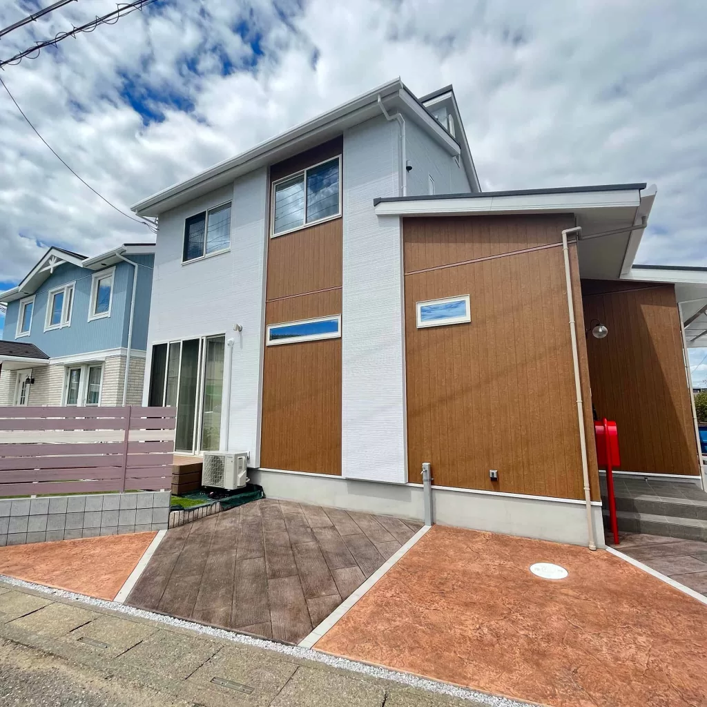 ツートンカラーのスタンプコンクリートや人工木のウッドデッキ、ホワイトのカーポートなど、様々な素材を組み合わせることで、可愛らしさと機能性を兼ね備えた、居心地の良いアウトドアリビング空間を創出しました。
