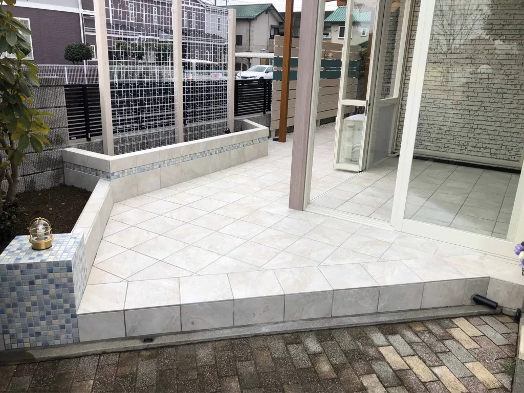 お客様の海への想いを叶え、モザイクタイルをアクセントにしたおしゃれな庭をデザインしました。