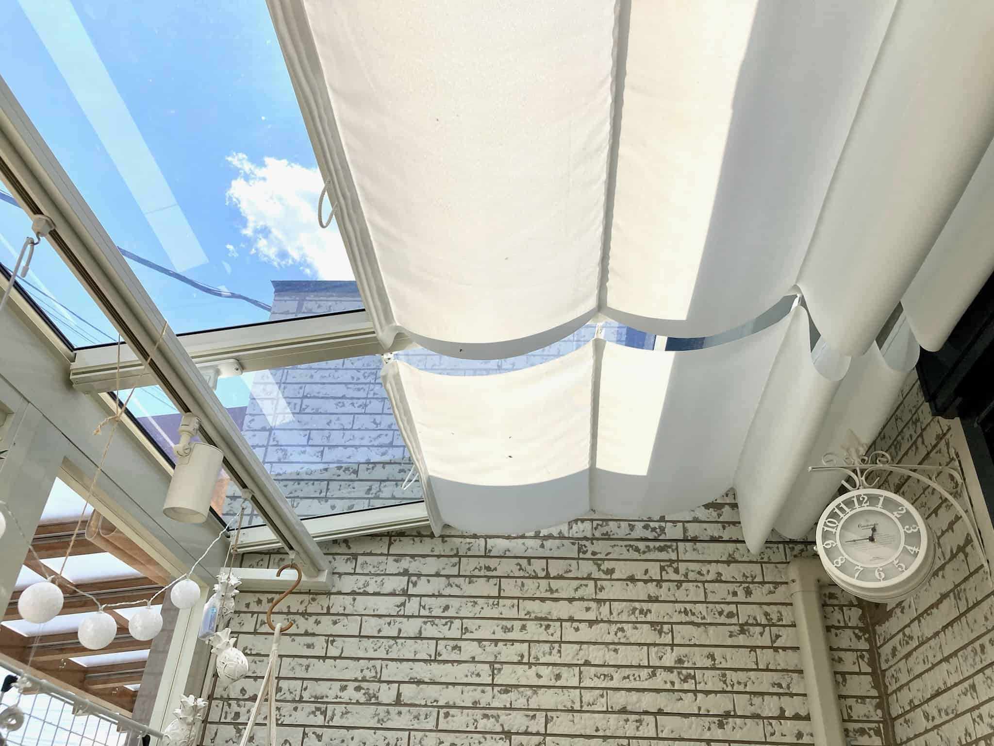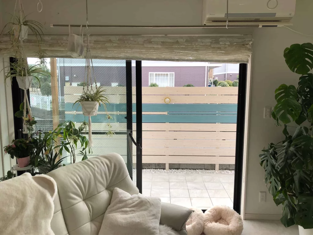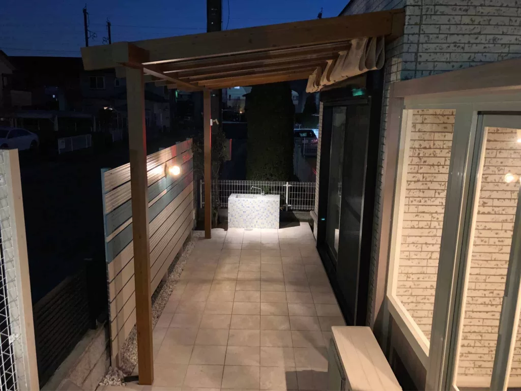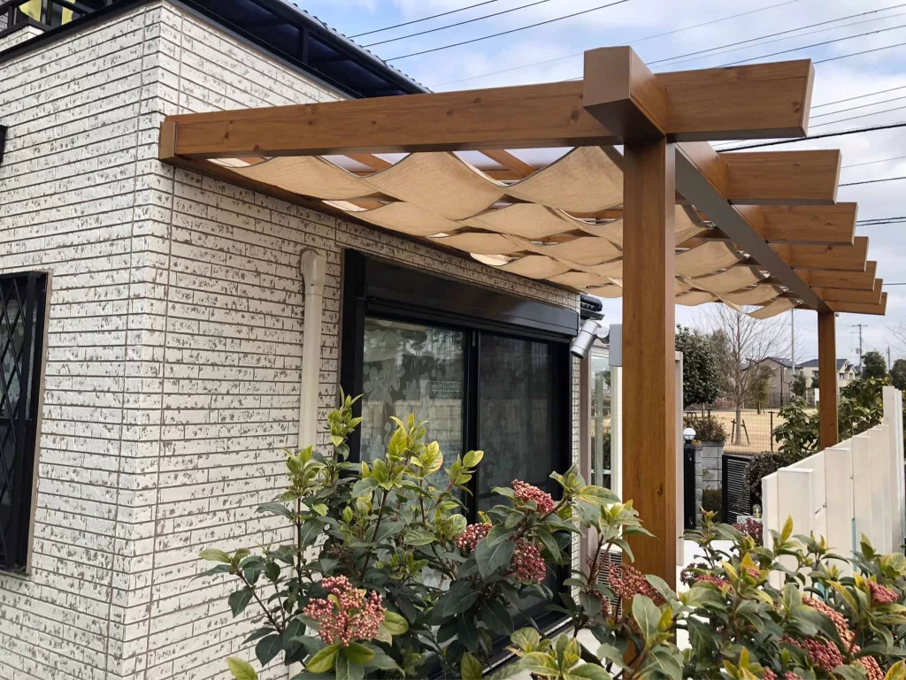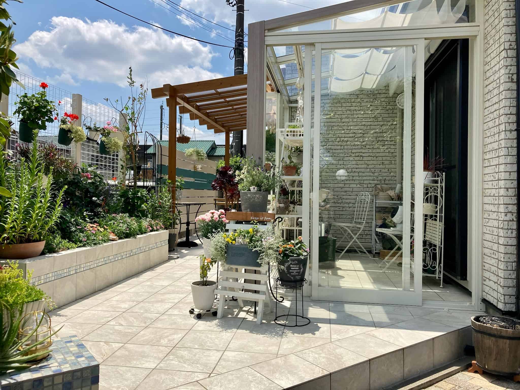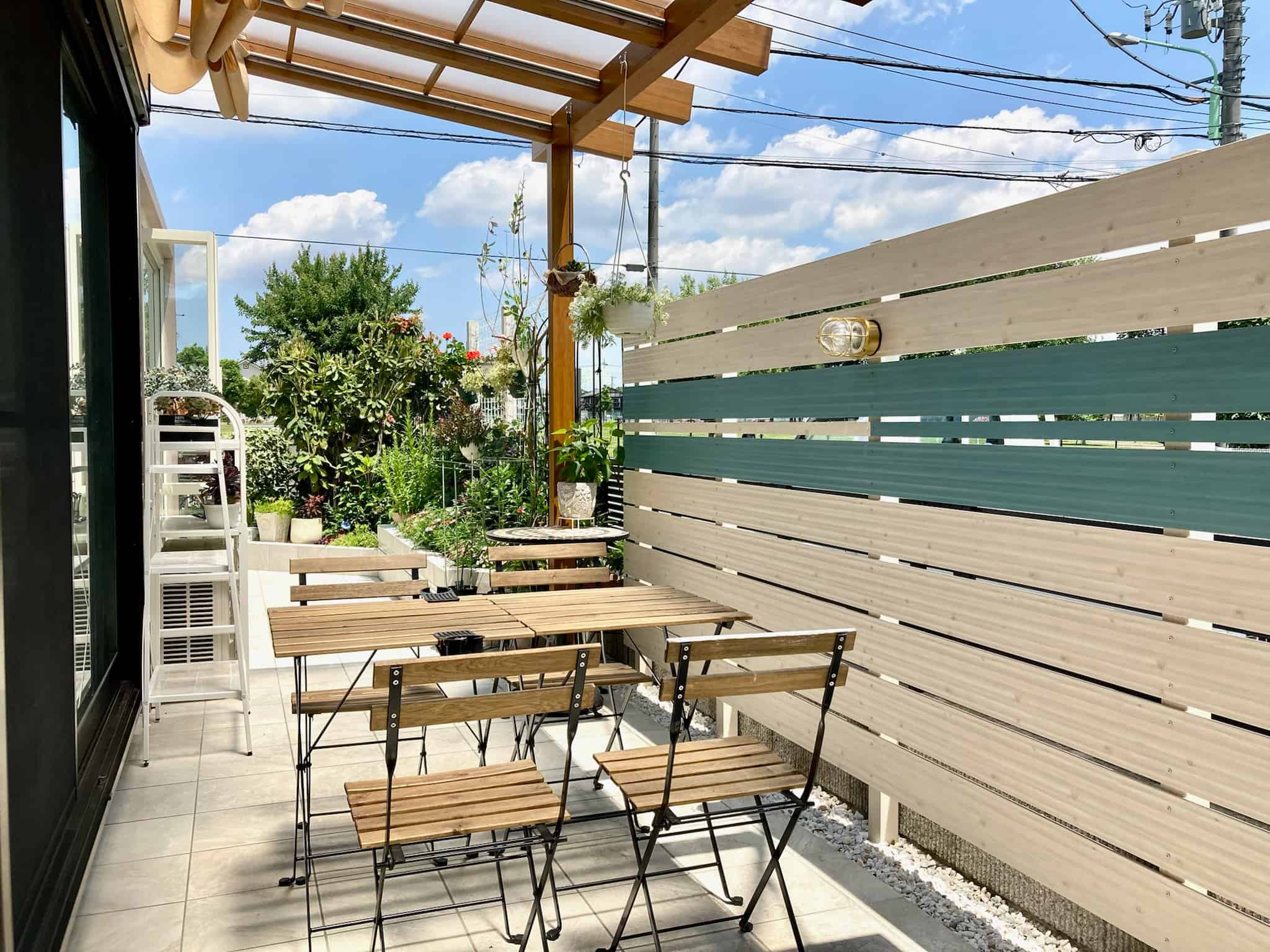 パーゴラ風のテラス屋根は、リビングを明るく保ちながら日除しにもなり、デザインガーデンオリジナルのフェンスは、リビングから眺めるたびに心が躍る美しいアクセントとなっています。