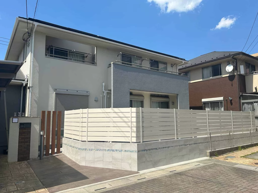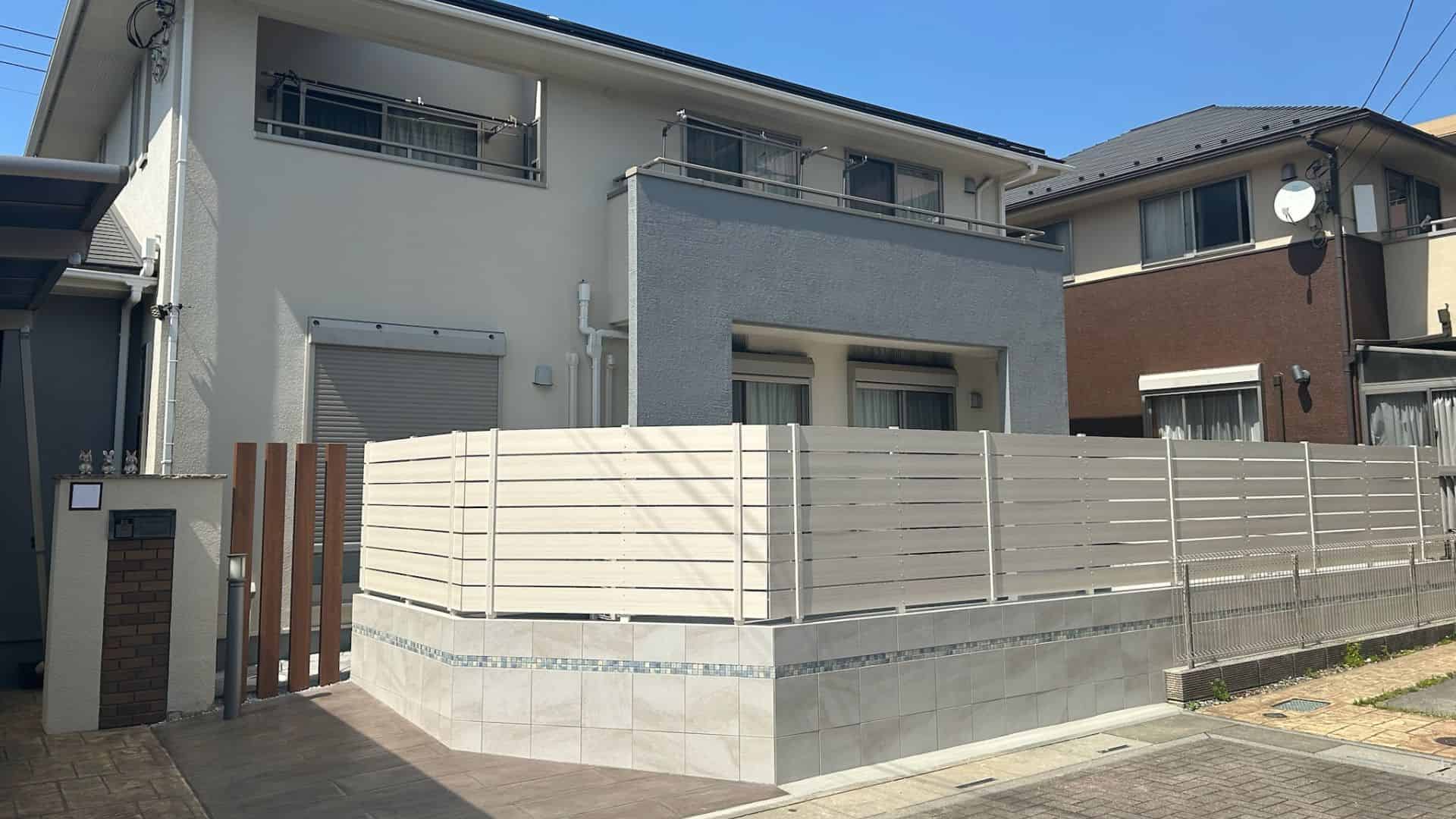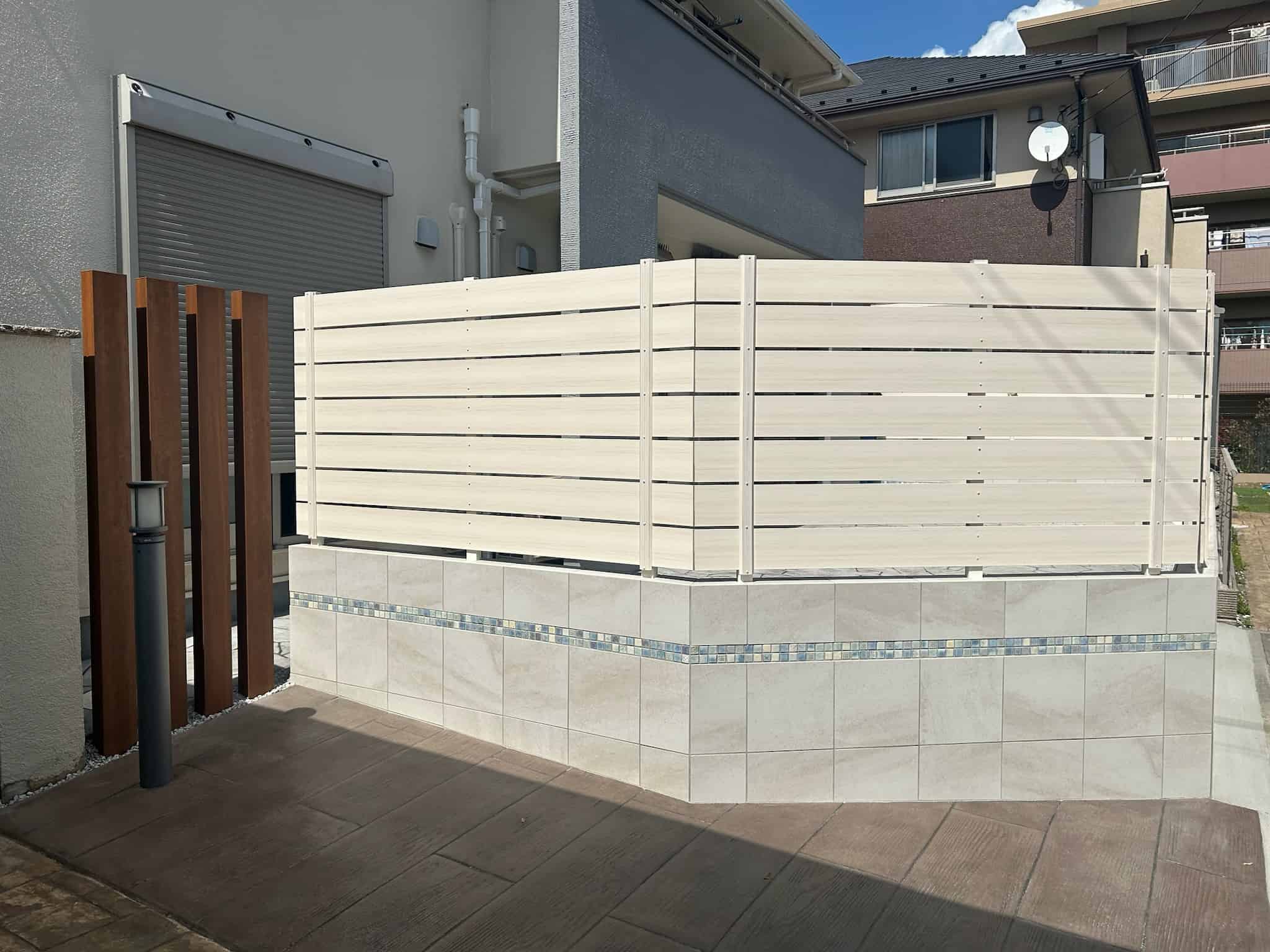 目隠しフェンスには人工木のオフホワイトを用い、高さを持たせてしっかり目隠し機能を維持しています。