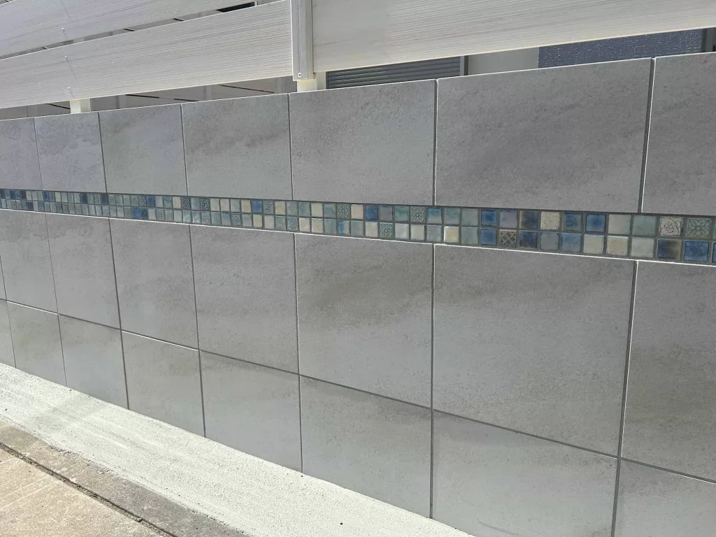 フェンスの足元にはブルー系モザイクタイルが使われ、デザイン性と高級感を向上。