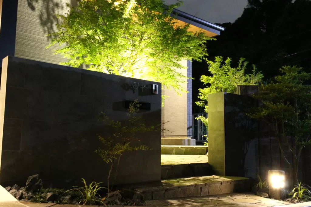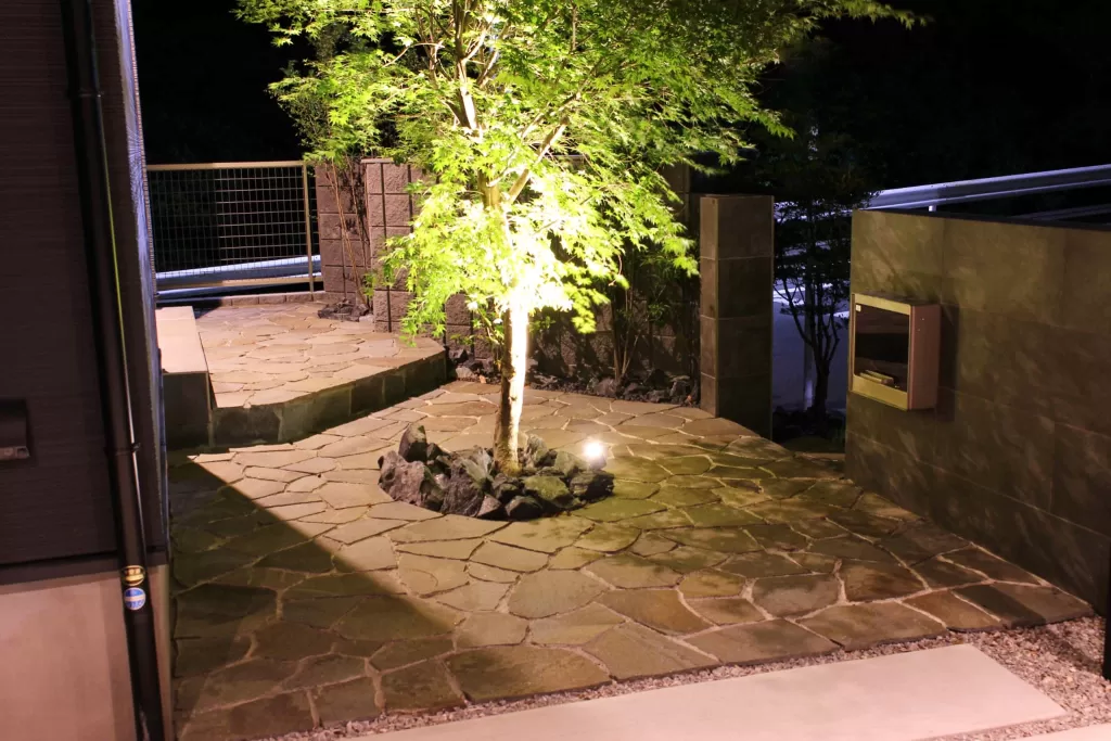 背景に窓等が無いため、LIXIL美彩のアップライトでシンボルツリーを照らし、影が建物に映るように計算したデザインとしました。