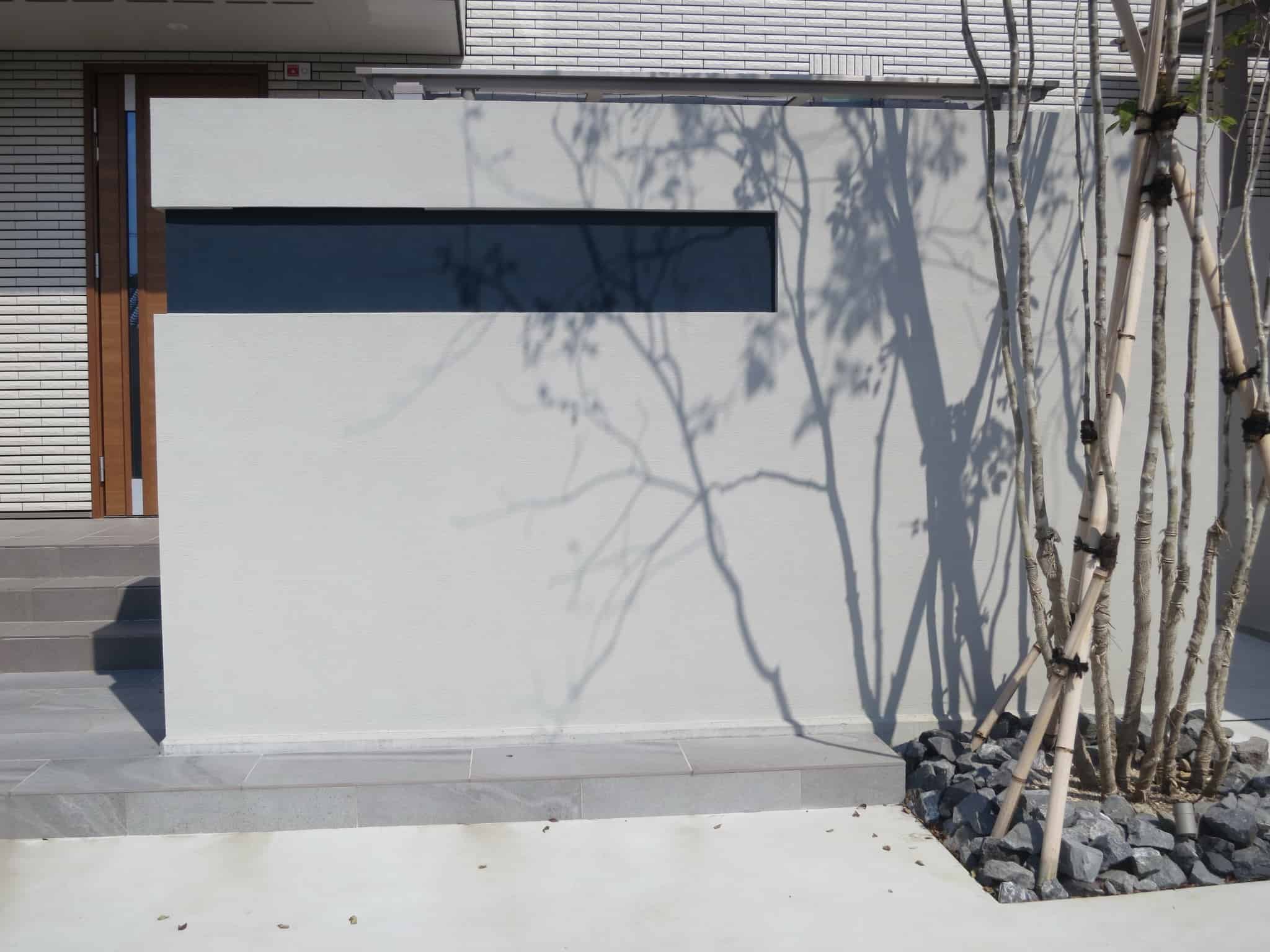 その塀は駐車場の車の目隠しとアオダモの背景にもなっています。スリットは車の出し入れの見通しのため。