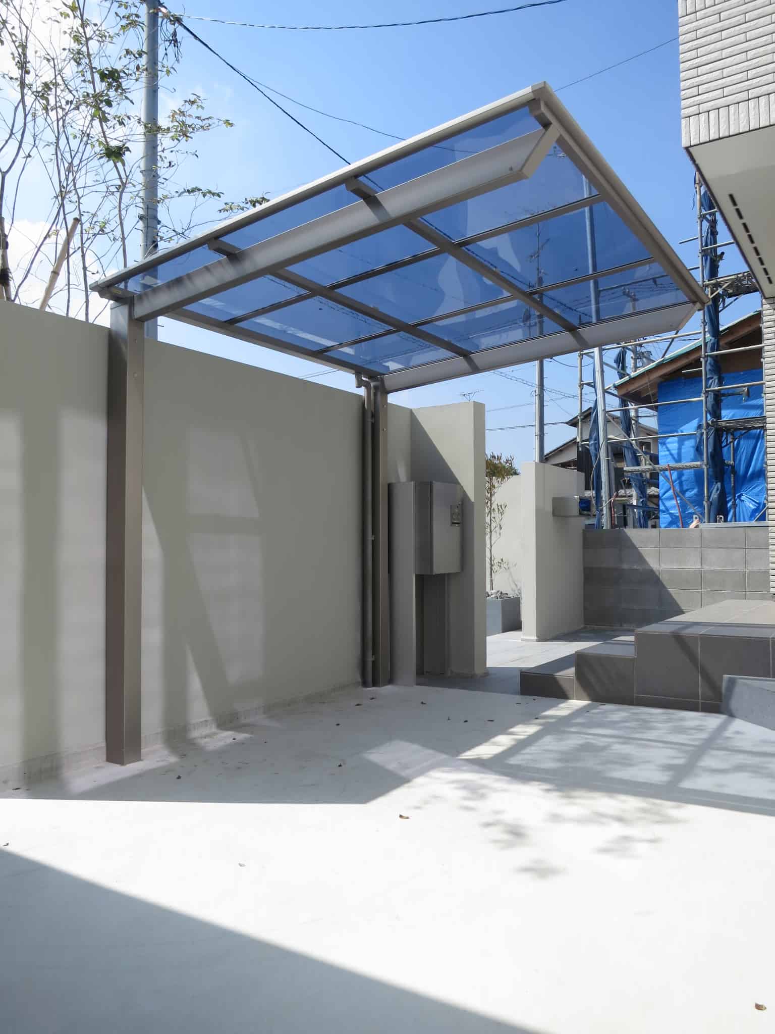駐車場とは別に設けること、濡れにくいこと、エントランスの印象に邪魔にならないこと。この条件をクリアする位置。