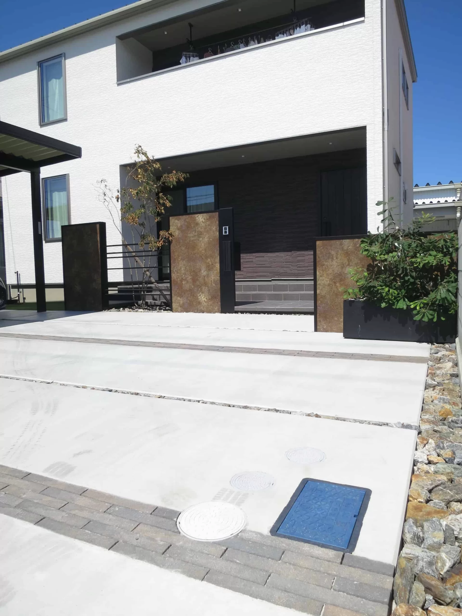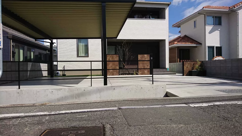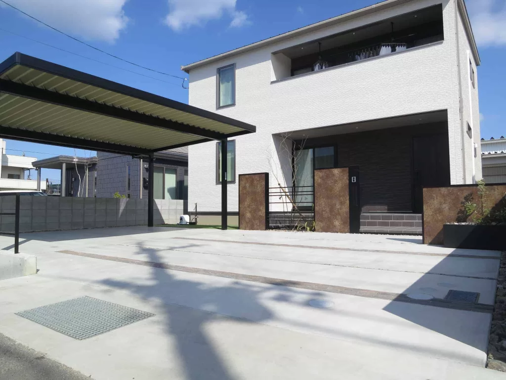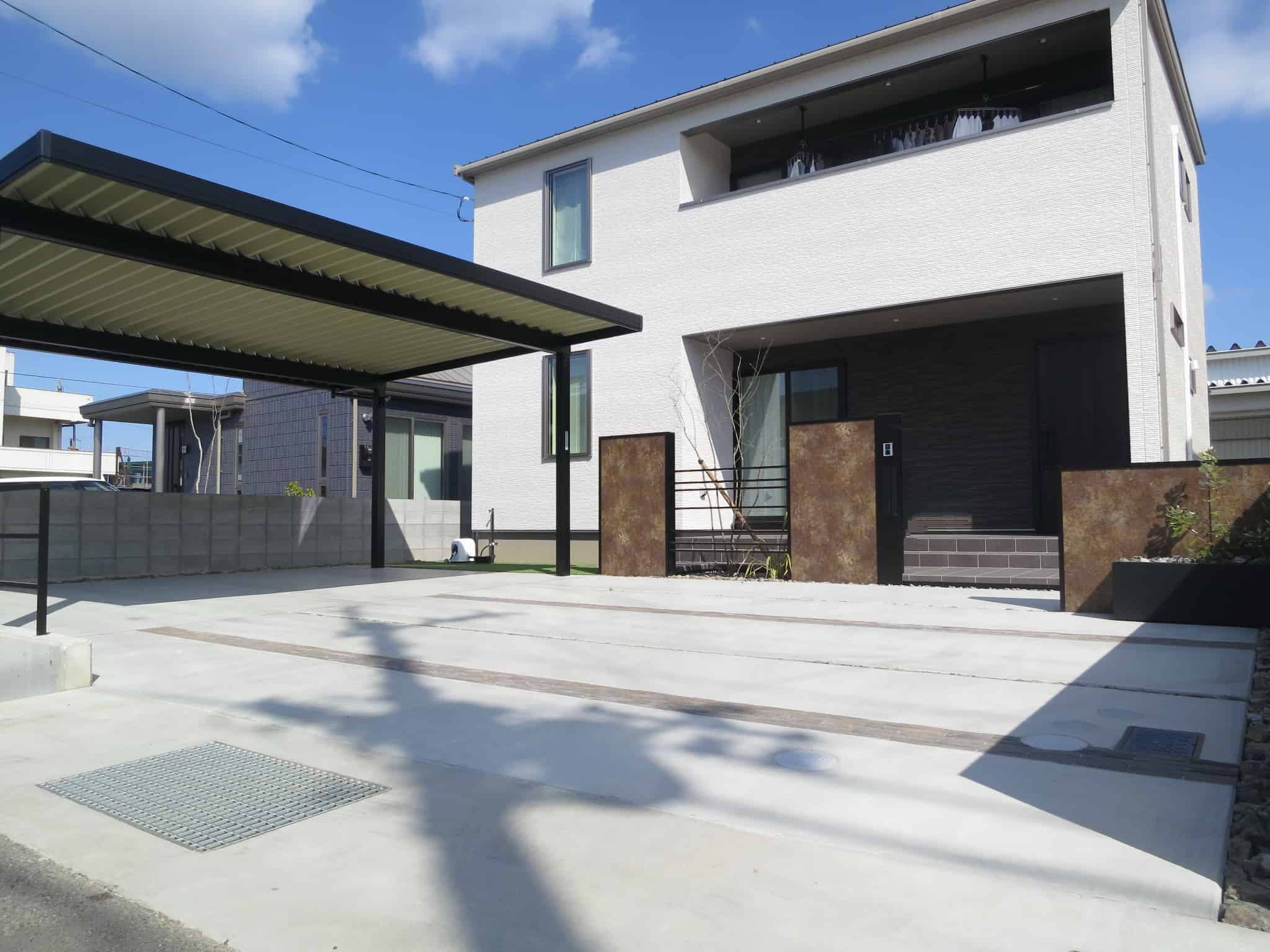 カーポートは屋根に厚みのある折板屋根を選択。オープン外構ですが重厚感がうまれました