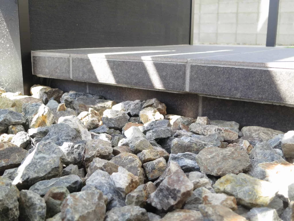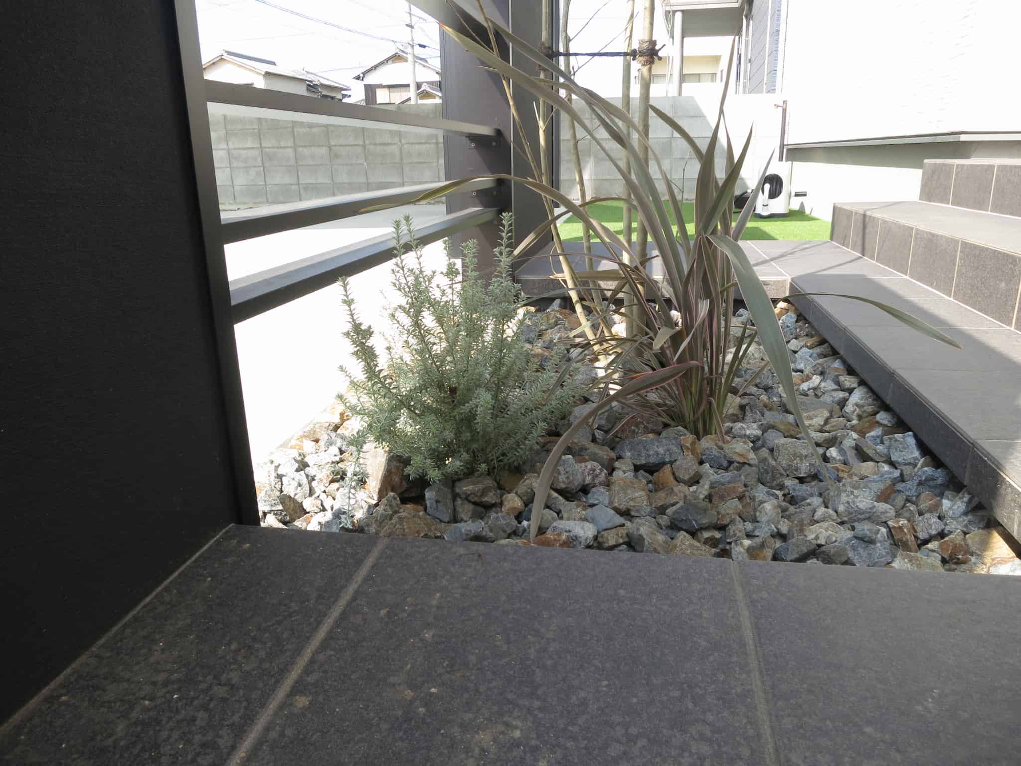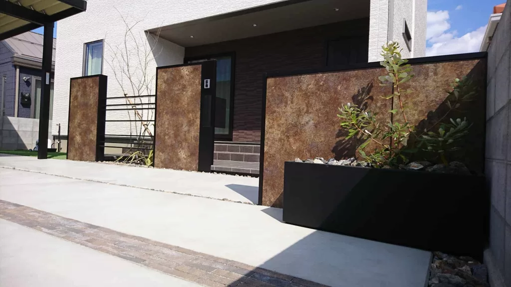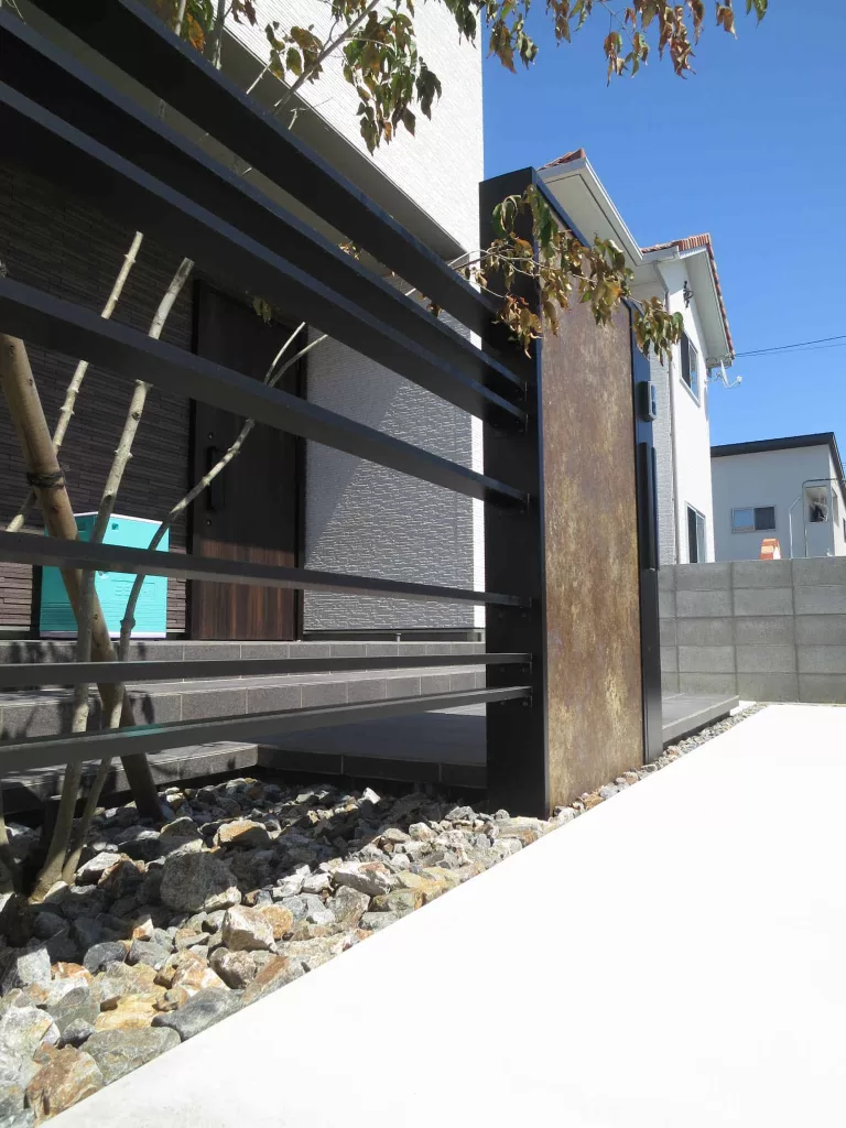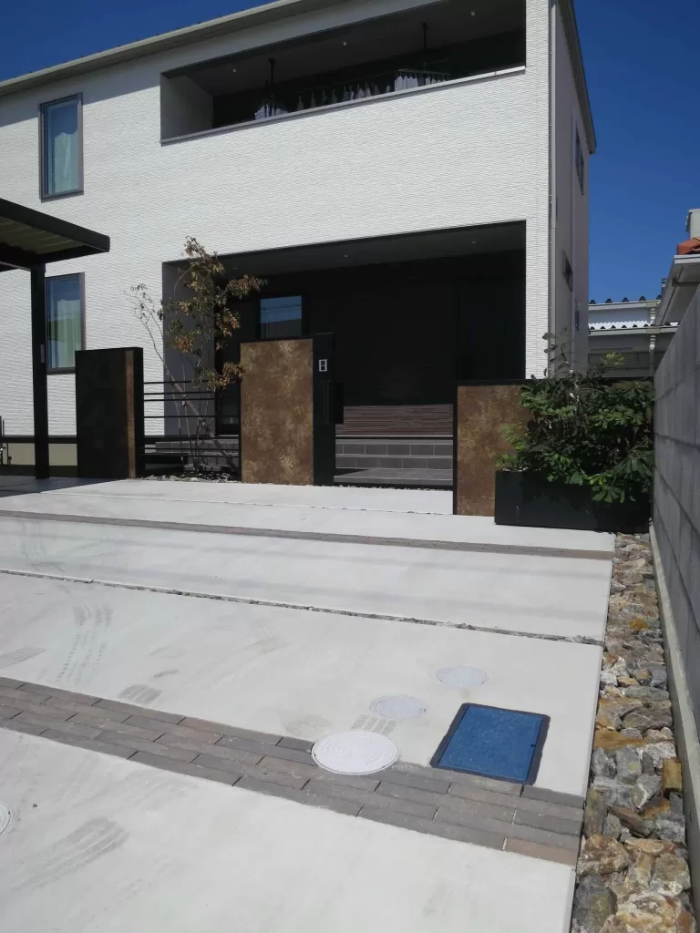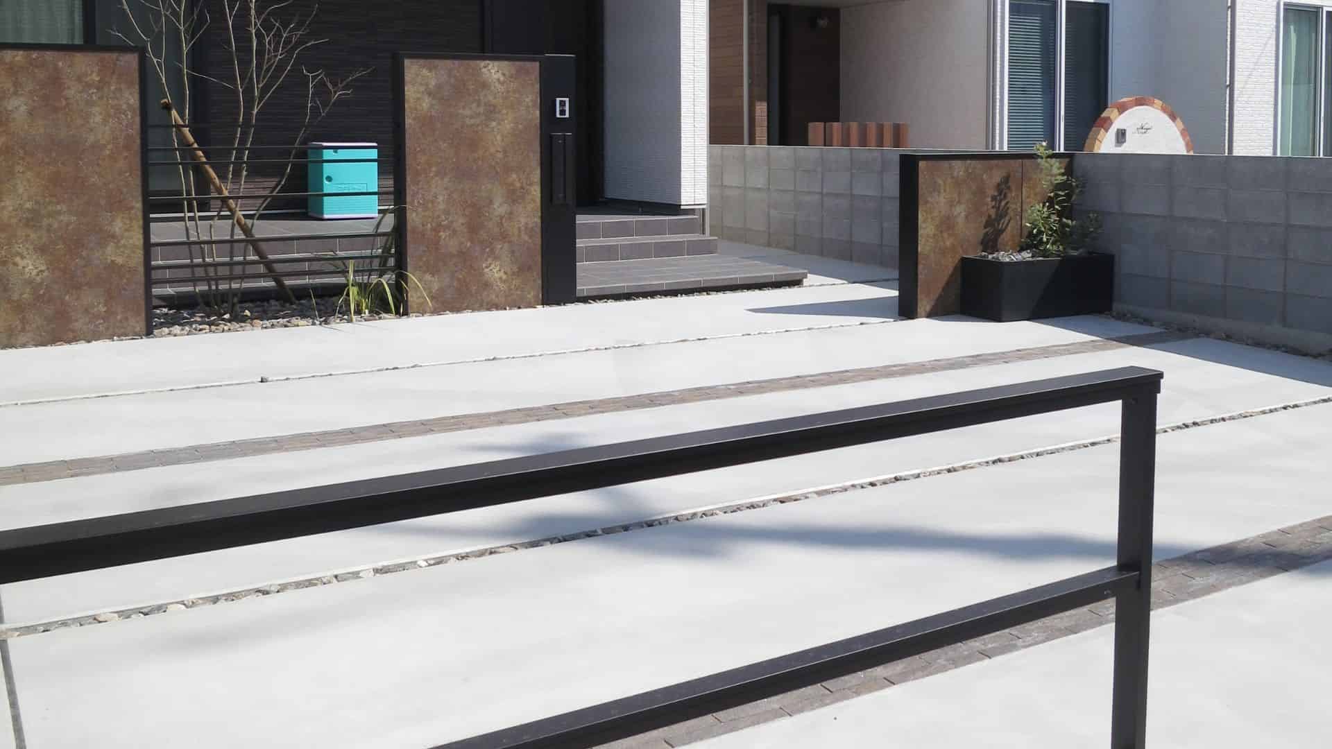 ニュアンスのある壁を駐車に邪魔にならないようにバランスよく配置し、エントランスに広がりと奥行きを持たせました。