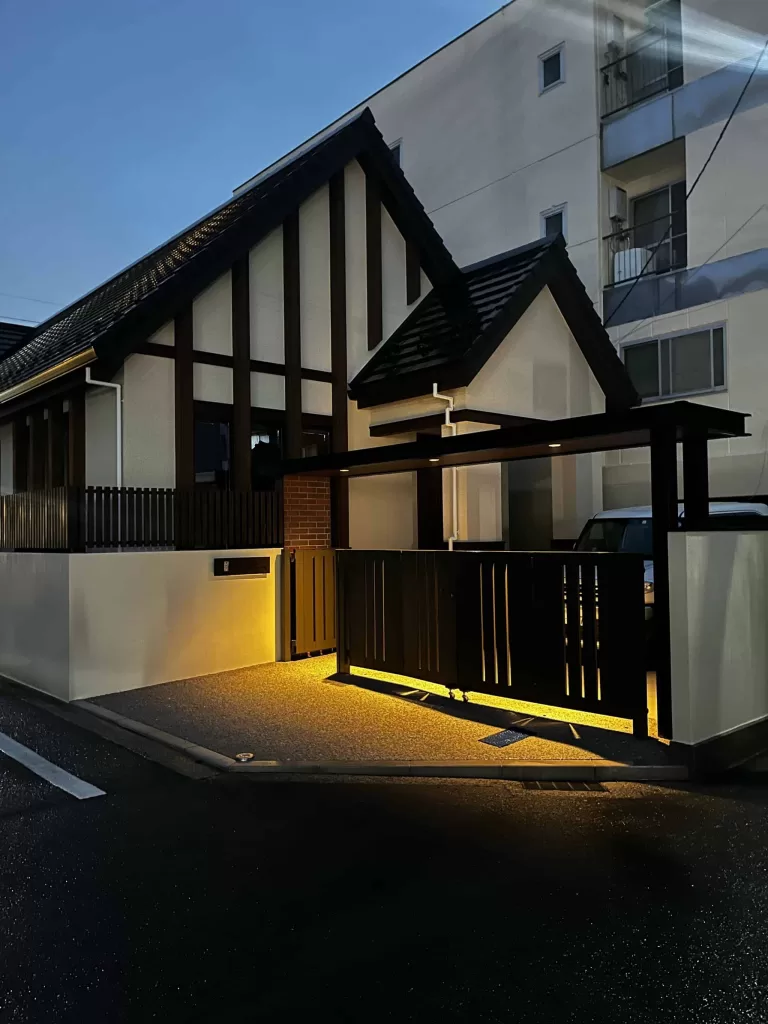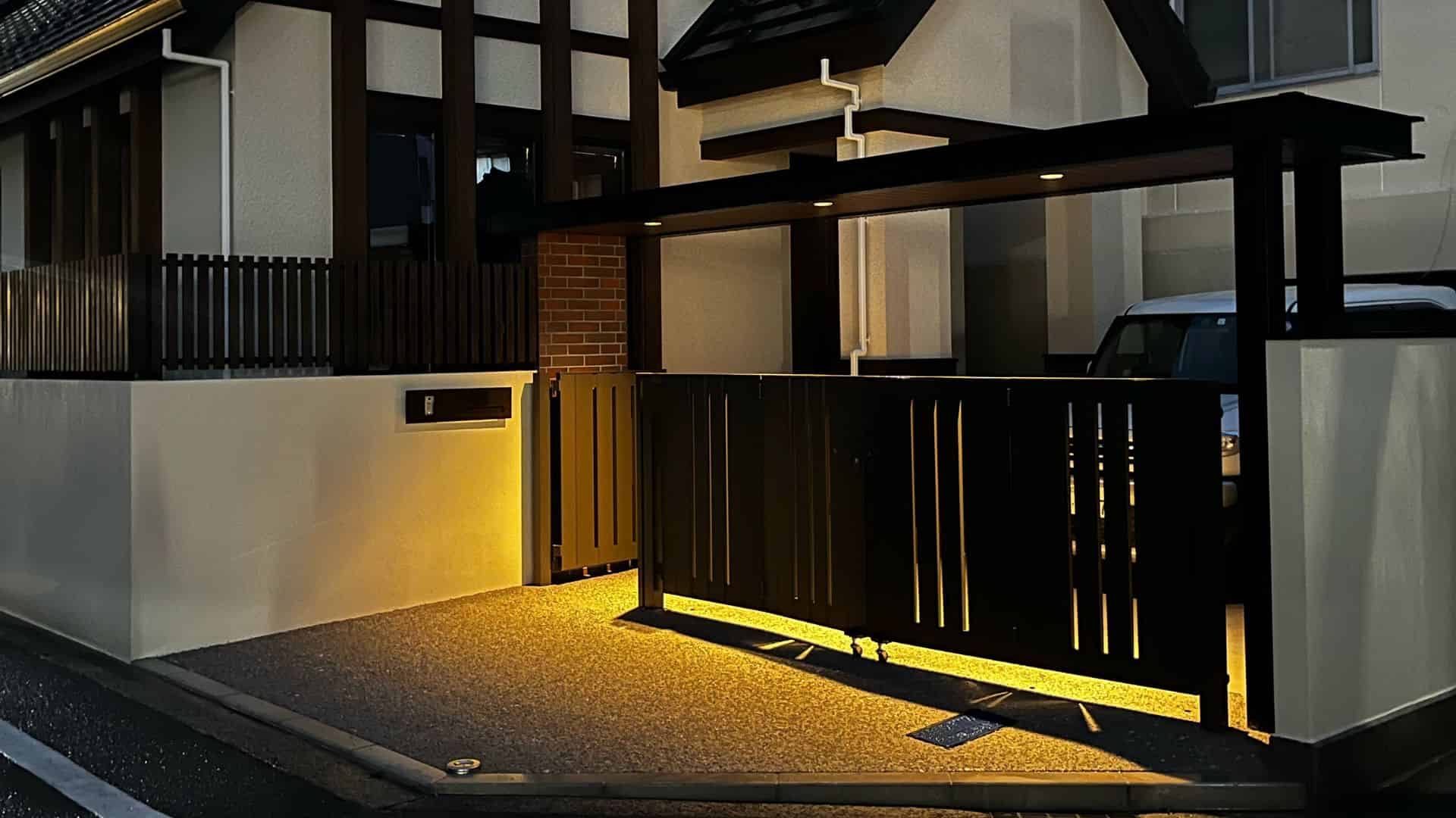 屋根のあるゲートがより一体感を感じるまとまりのあるものにまとめてくれています。