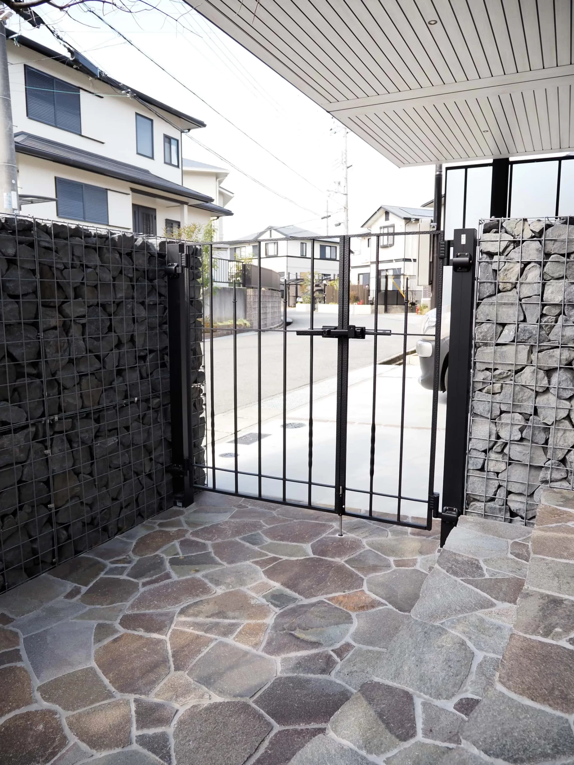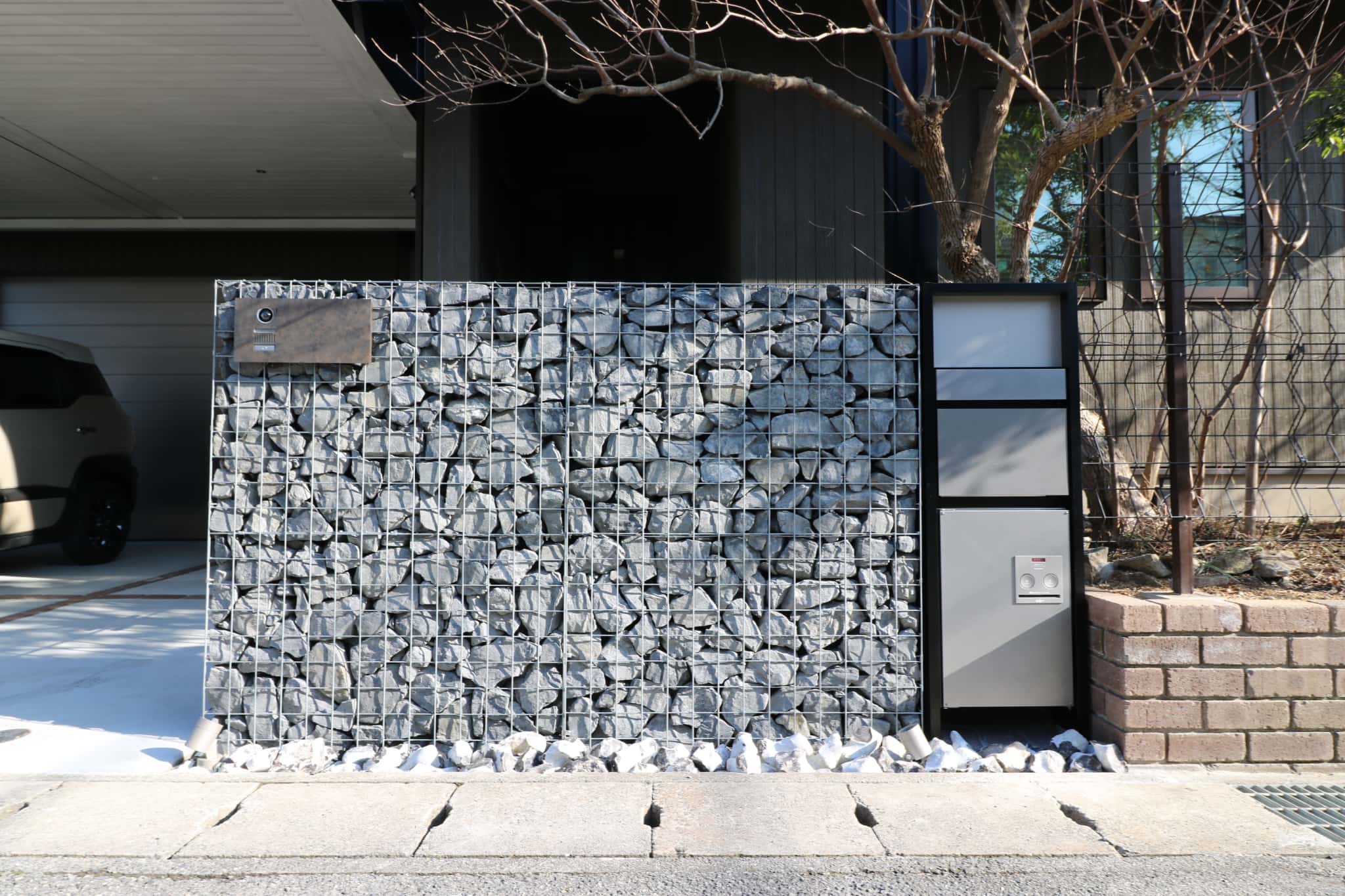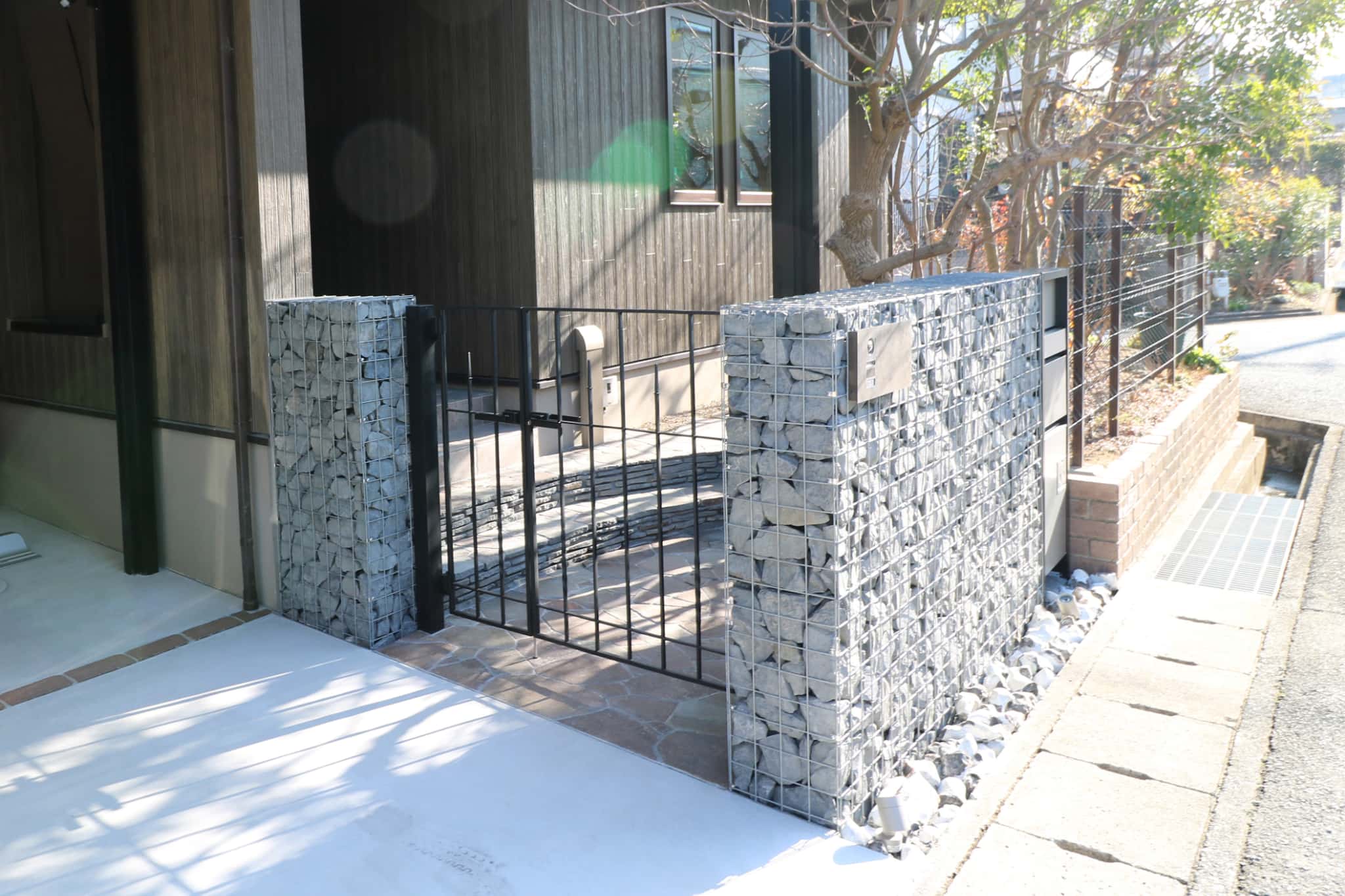 ガビオンを配したこだわりの門まわり。