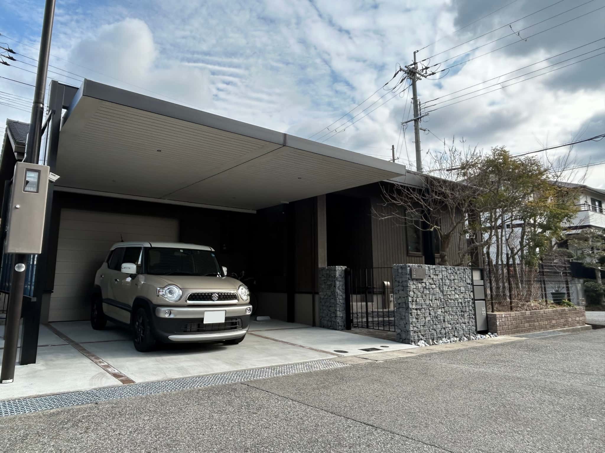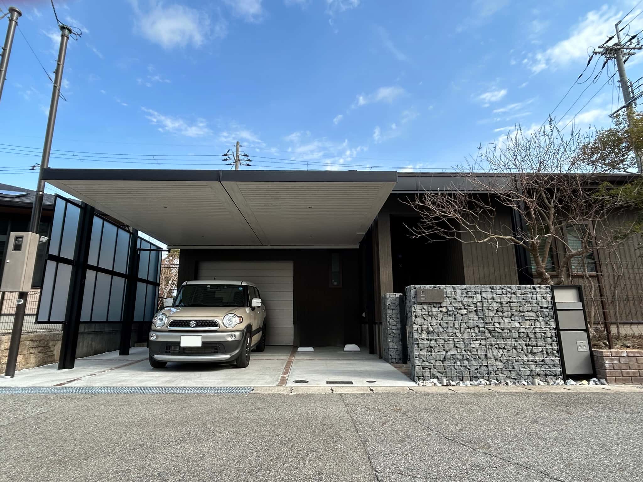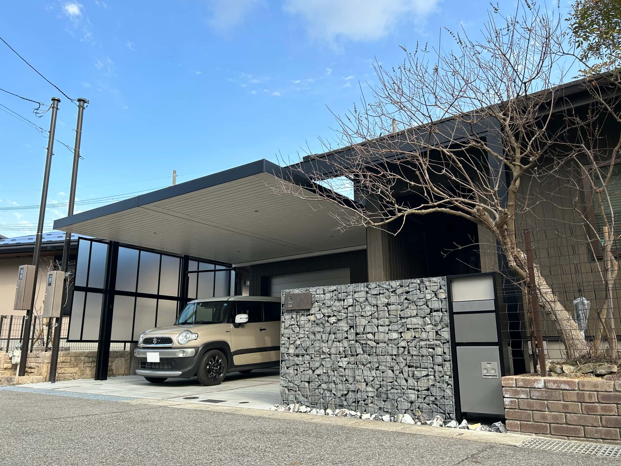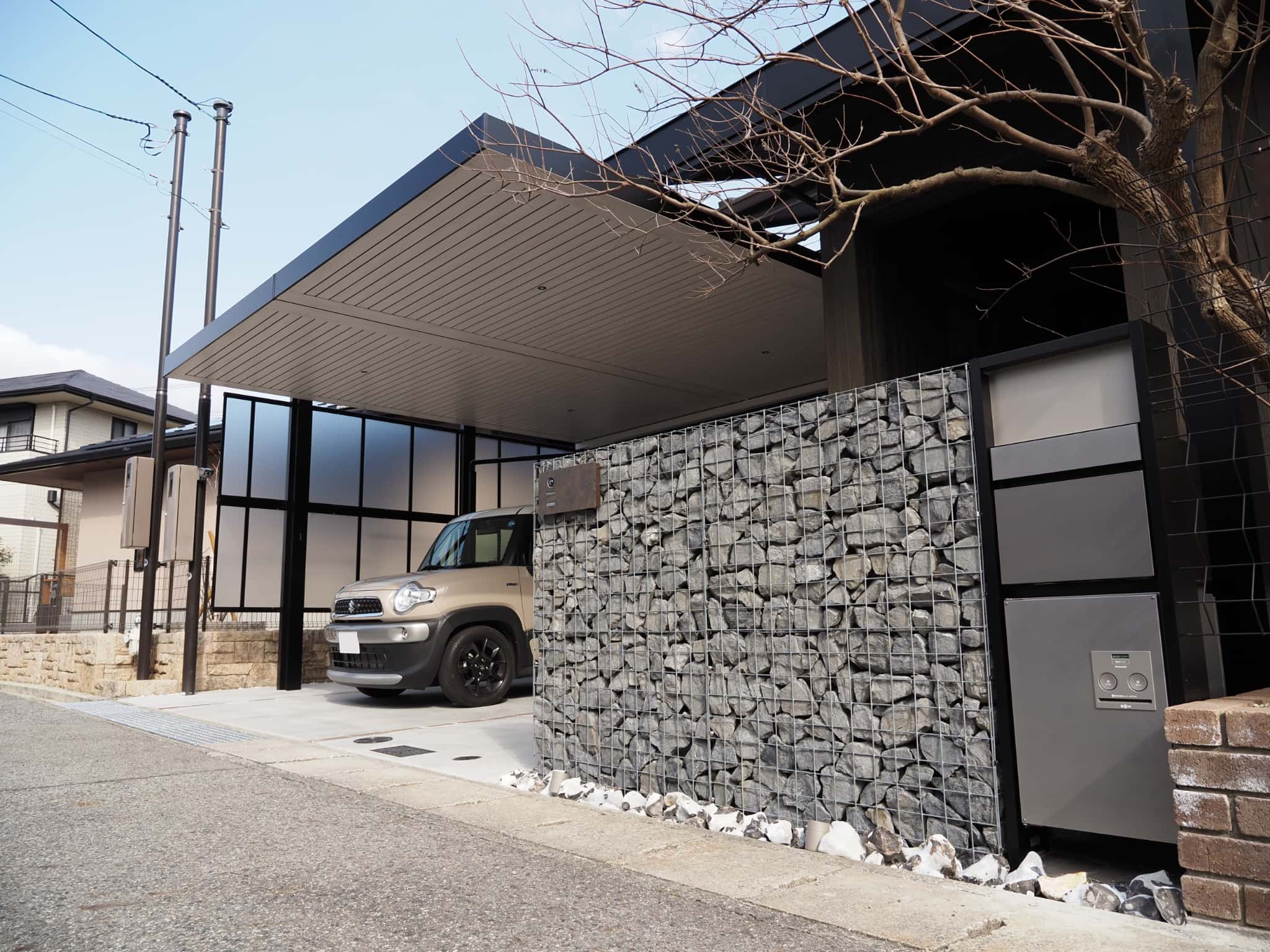 ガビオンを配したこだわりの門まわり。