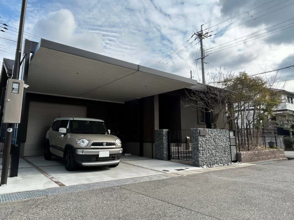 夜の装いはカーポートの天井材にダウンライトを。