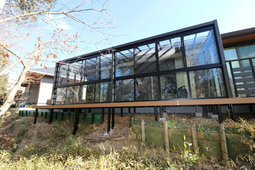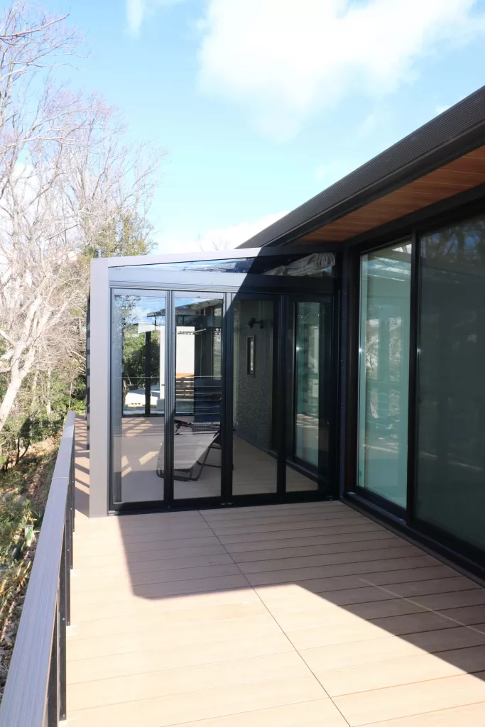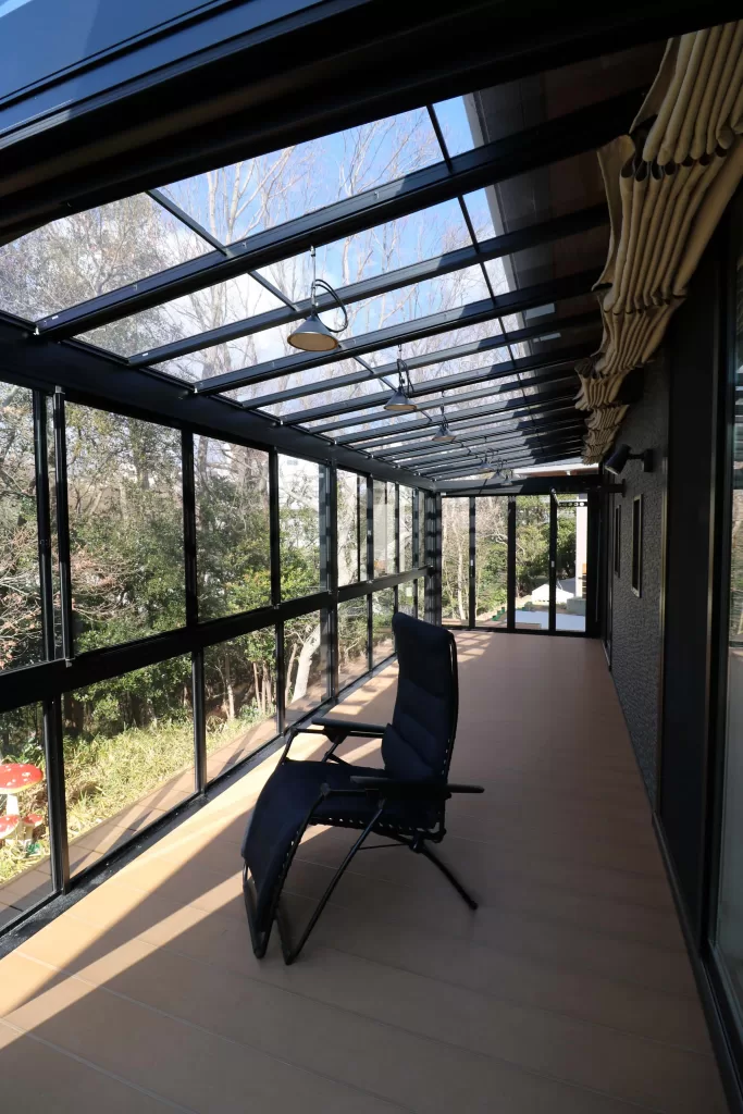 林に面した南西の窓には 15mのウッドデッキに、2間×2棟を連棟加工し間口 7mを超えるガーデンルームを施工しています。