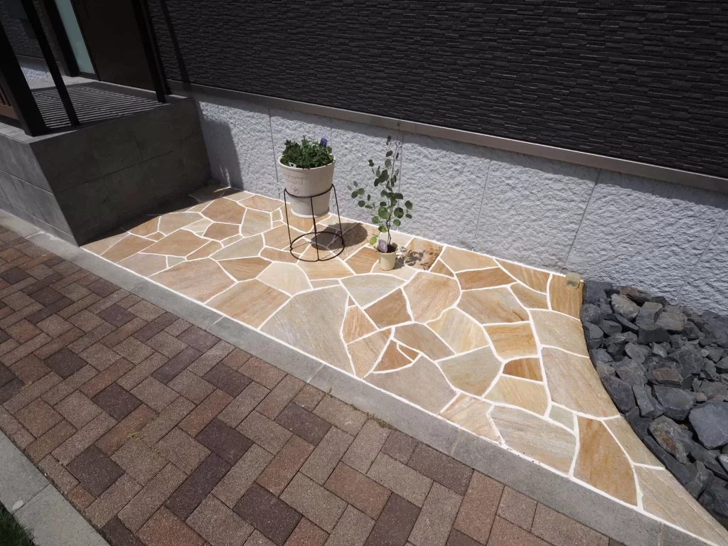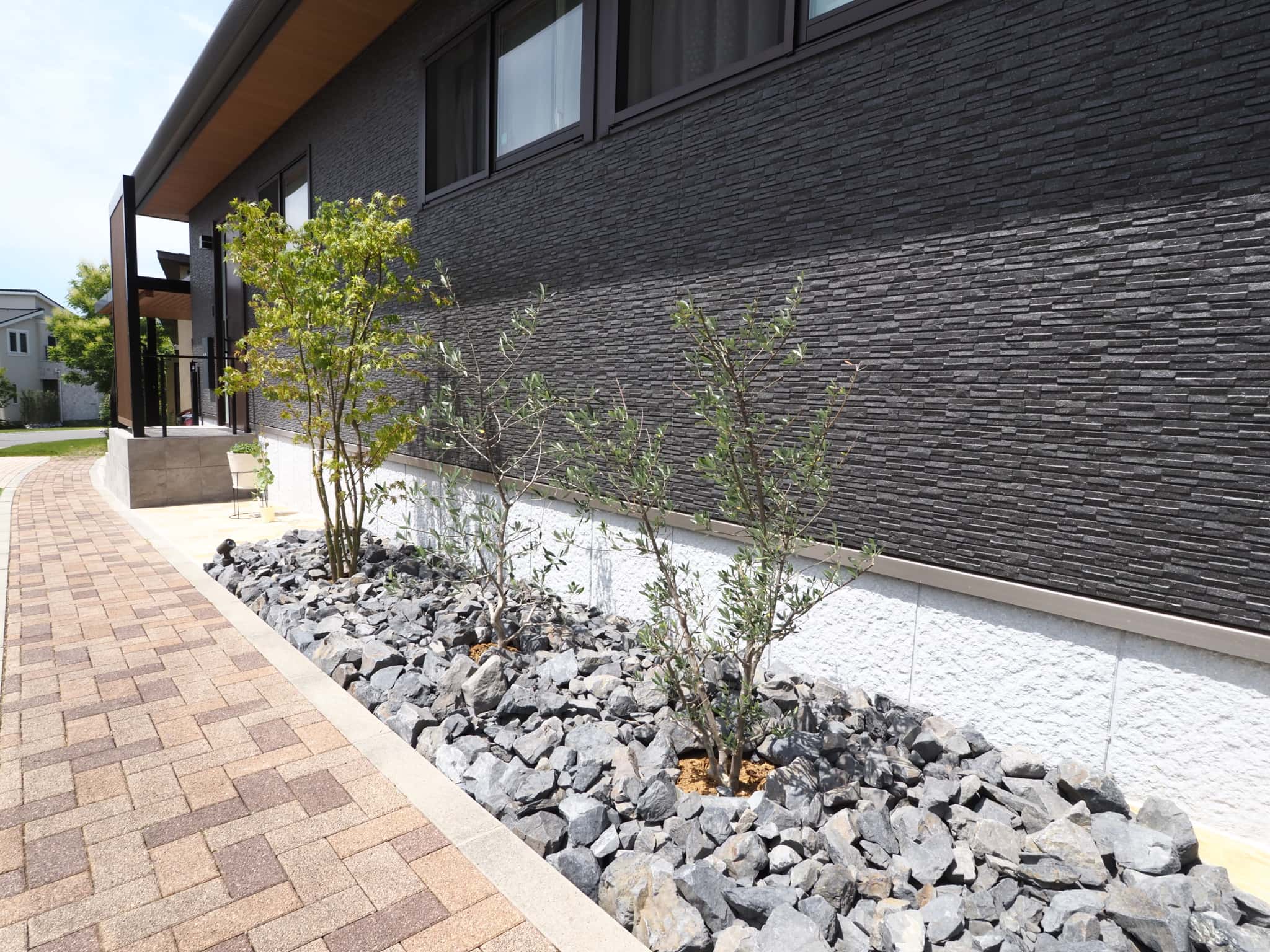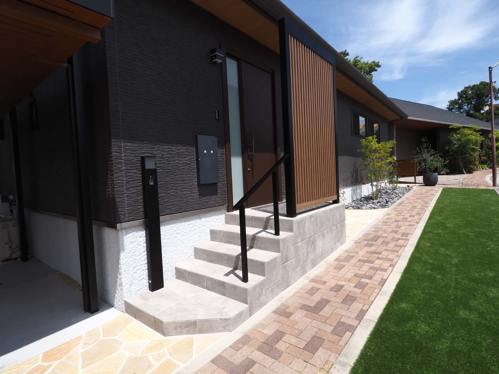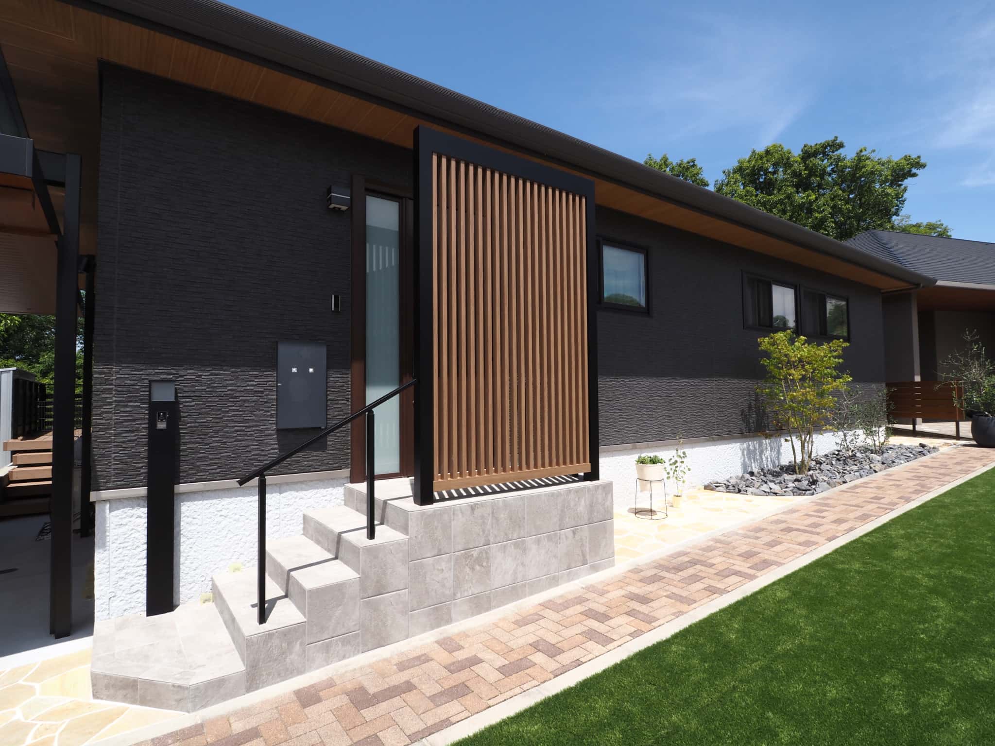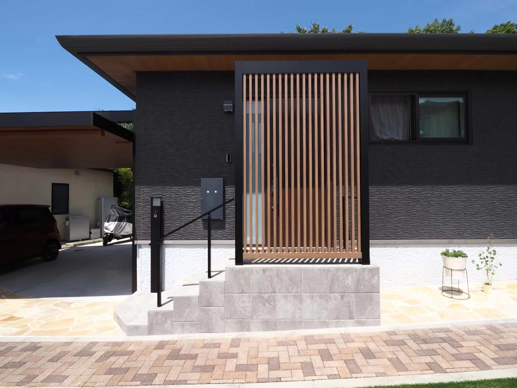 通りに面した玄関ドア前に縦格子のGスクリーンを設置