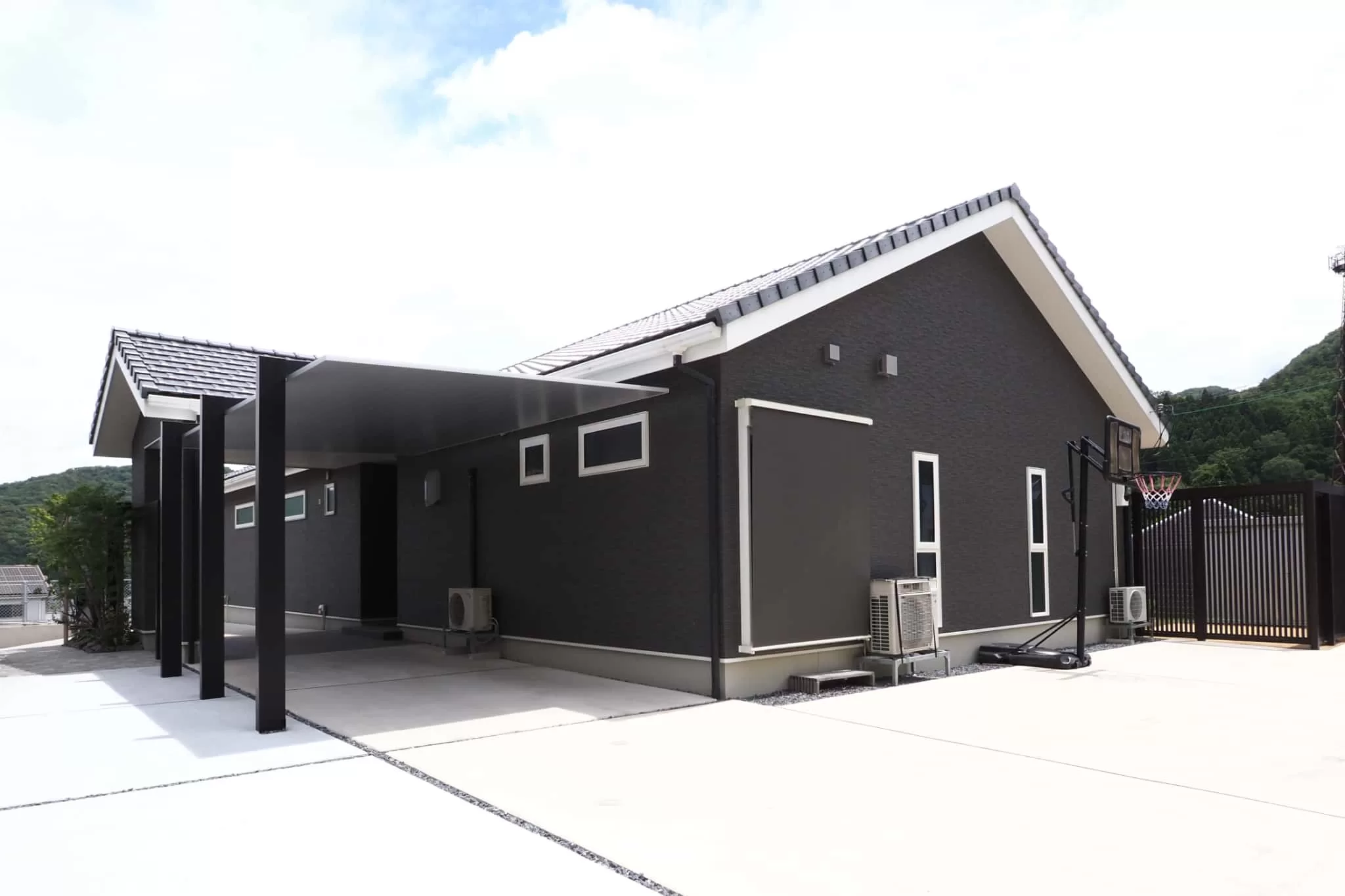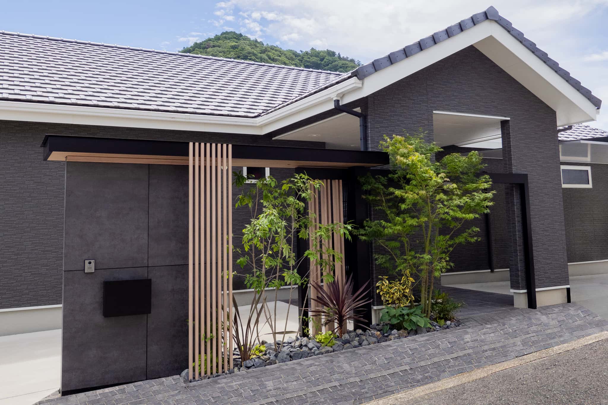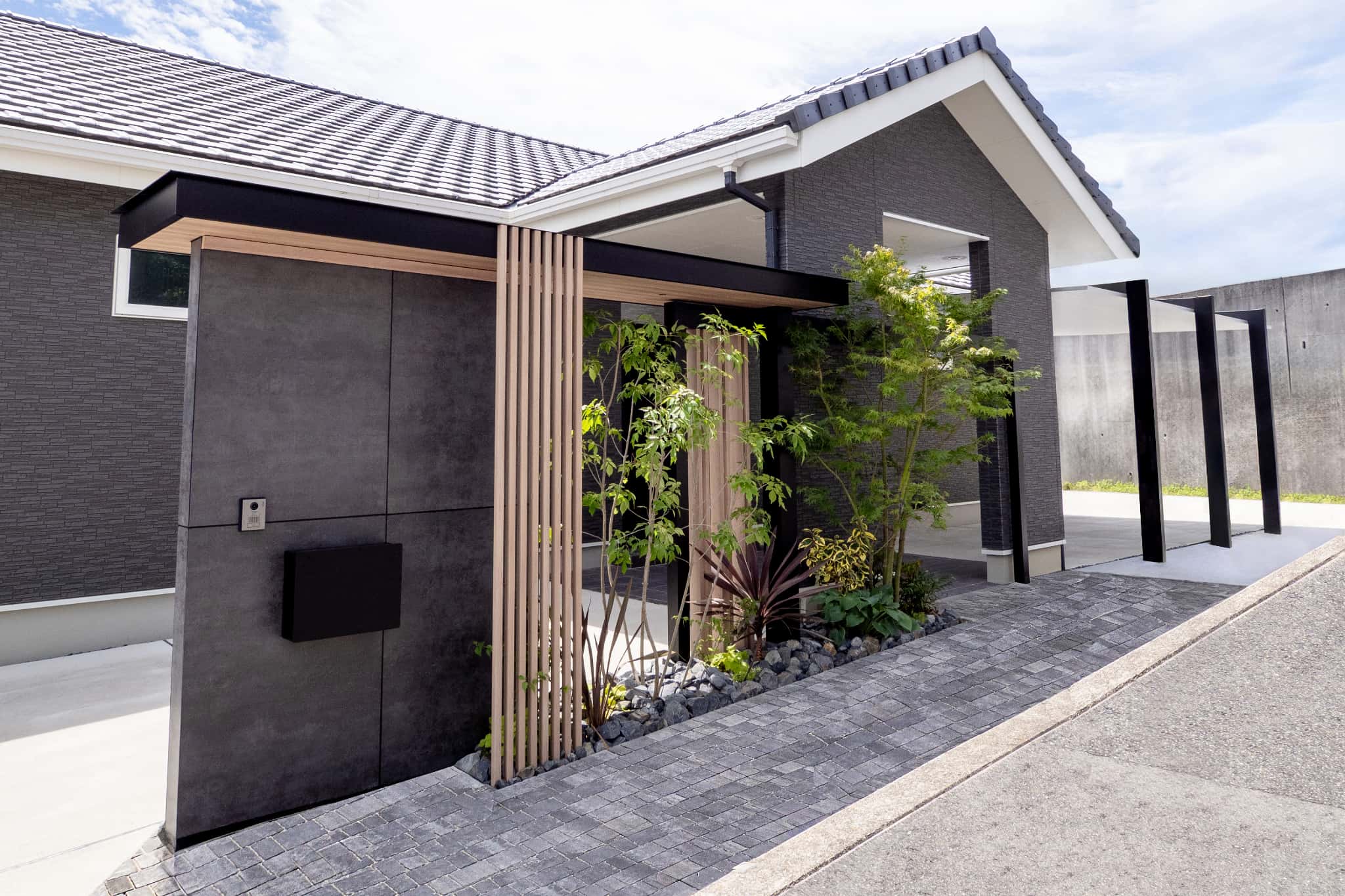 大きな駐車スペースはインターロッキングを敷き詰め、重厚感のあるヨーロッパの石畳みのような仕上がりに。