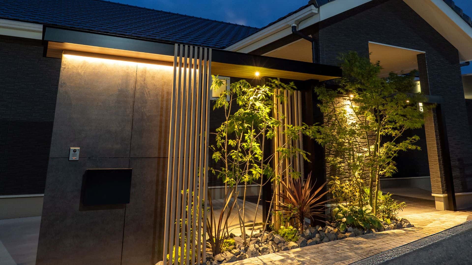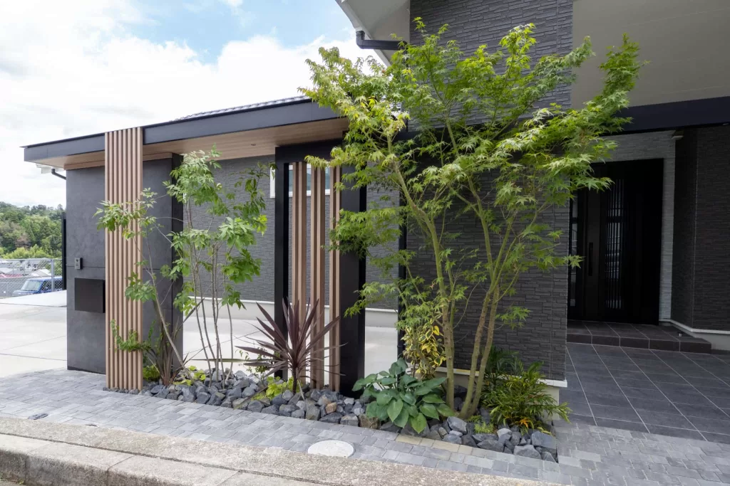 また、建て直しをする前にあった大きく味のある庭石を再利用し、モミジの木と合わせてモダンなファサードとなっています。