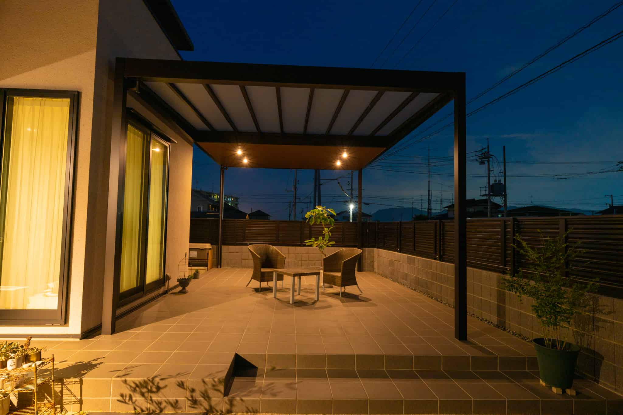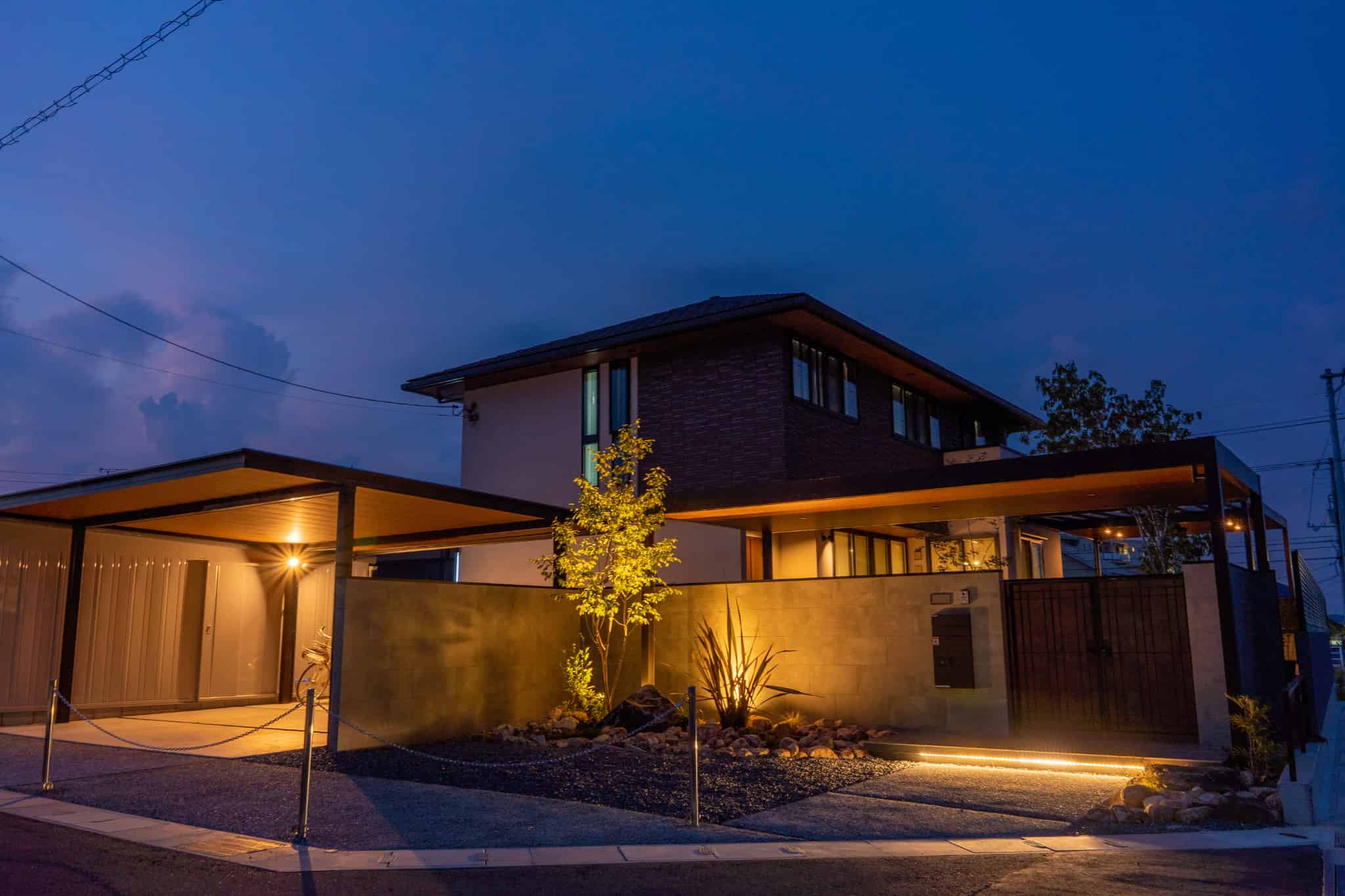 エクステリアの魅力を最大限に演出するためのスポットライトやダウンライトで、昼と夜で雰囲気を変えるのも魅力的。