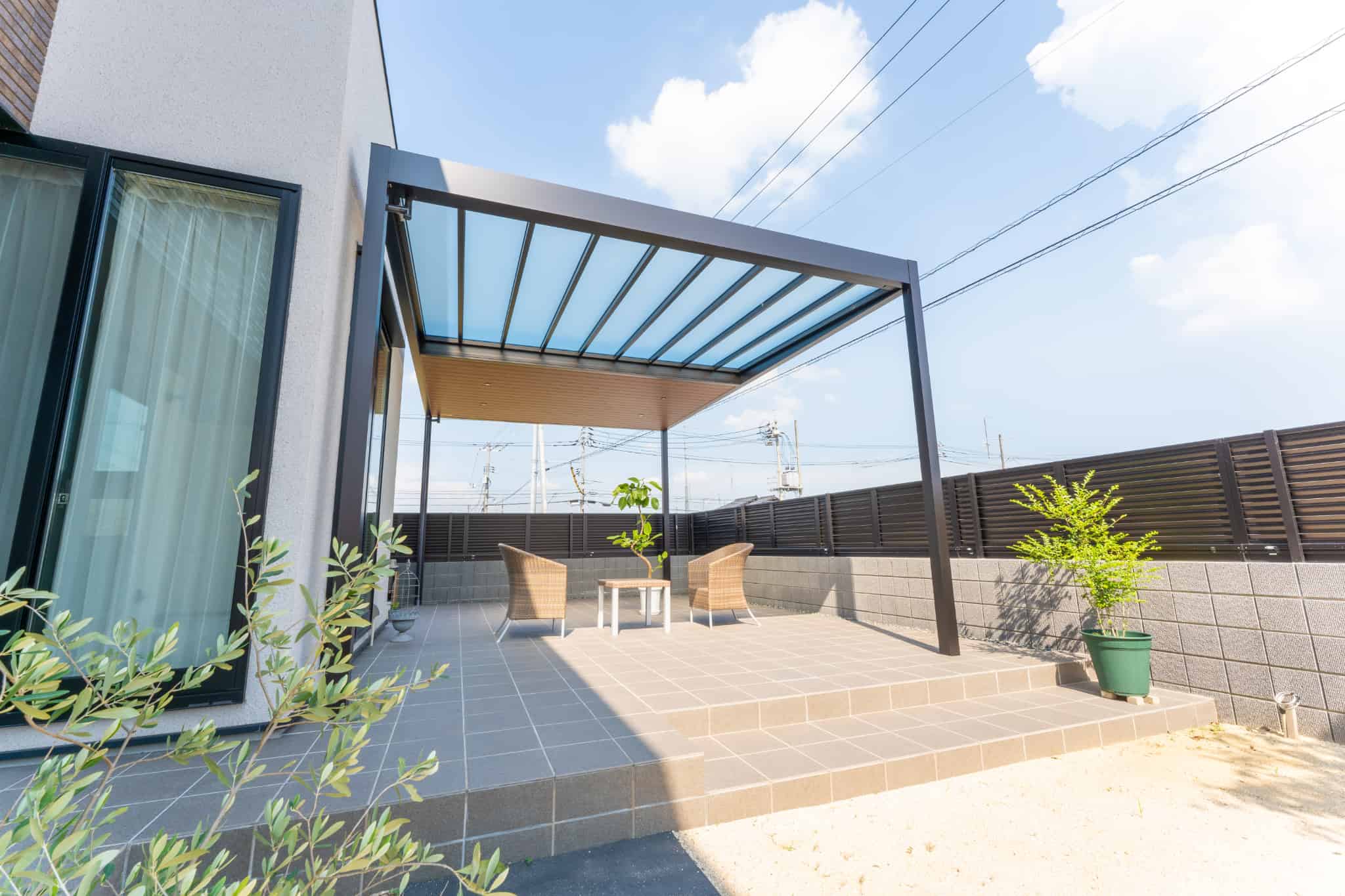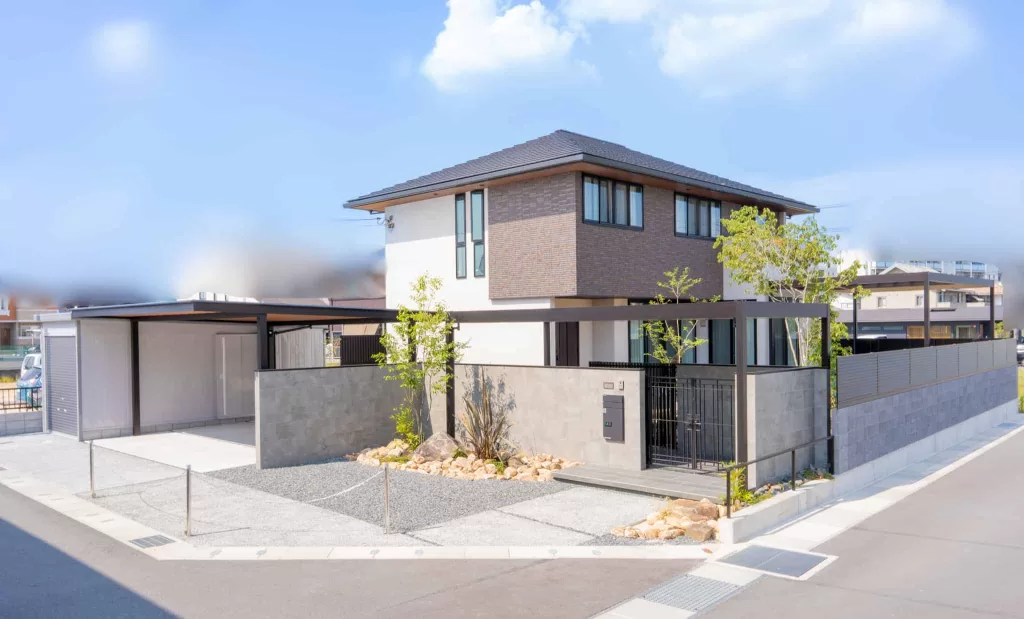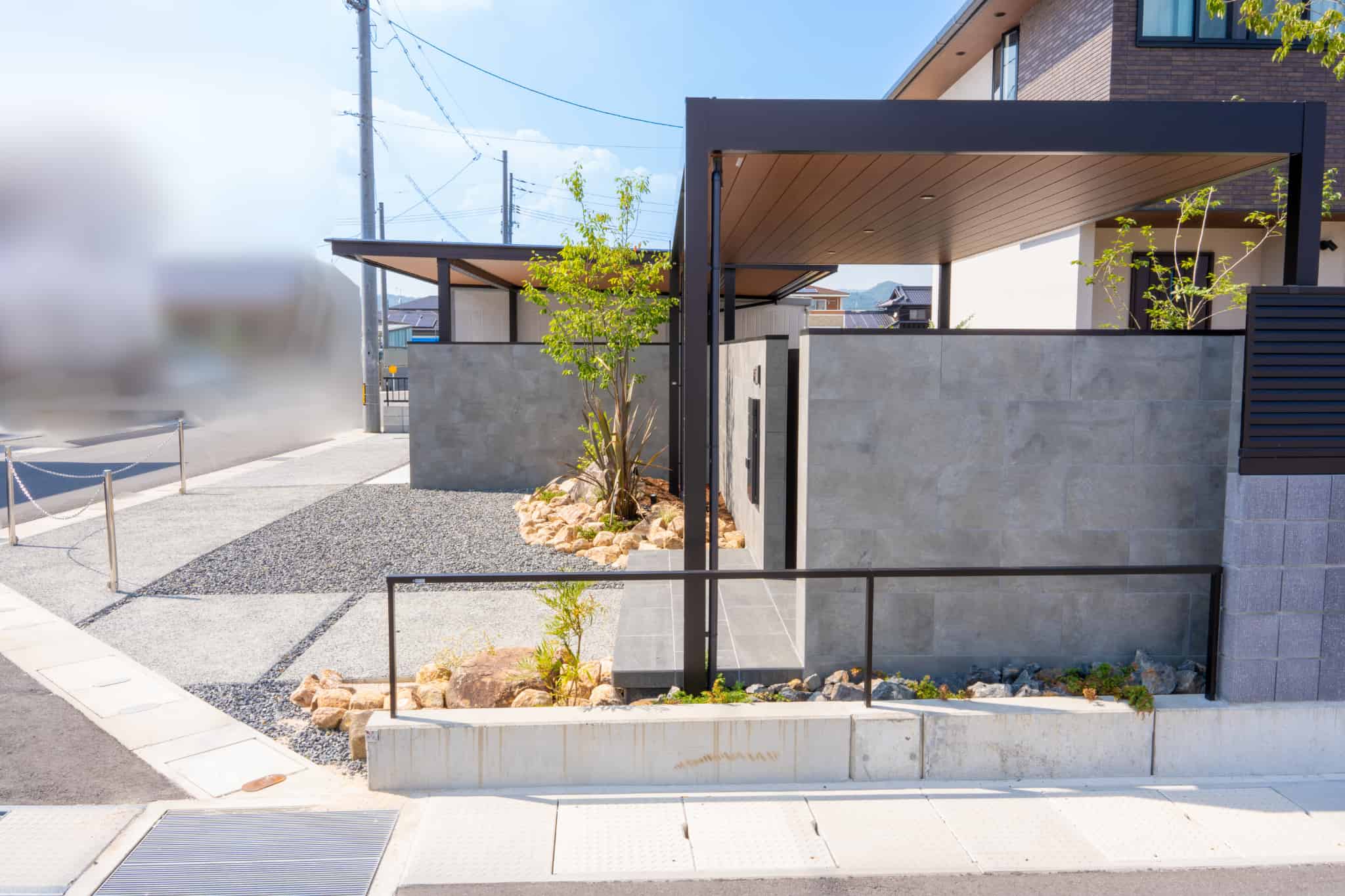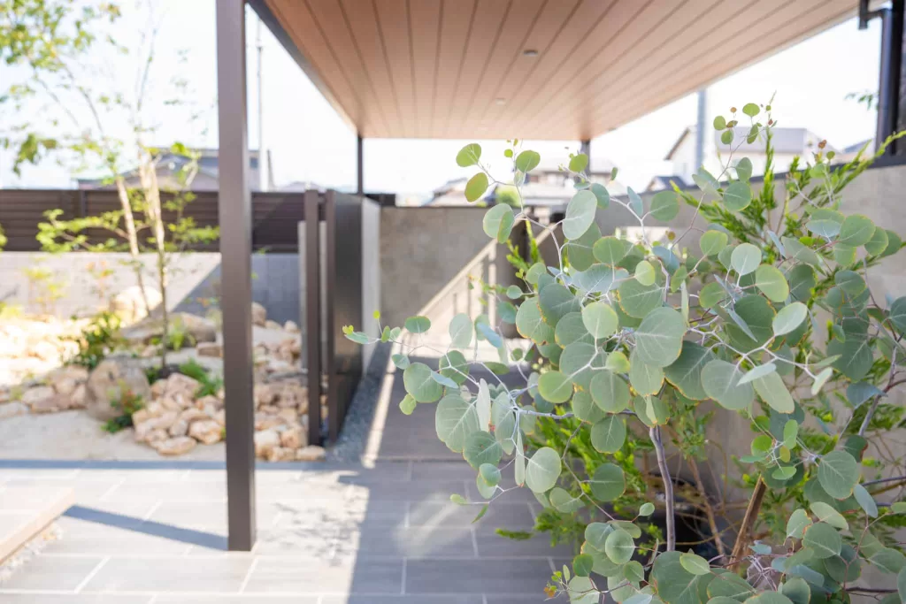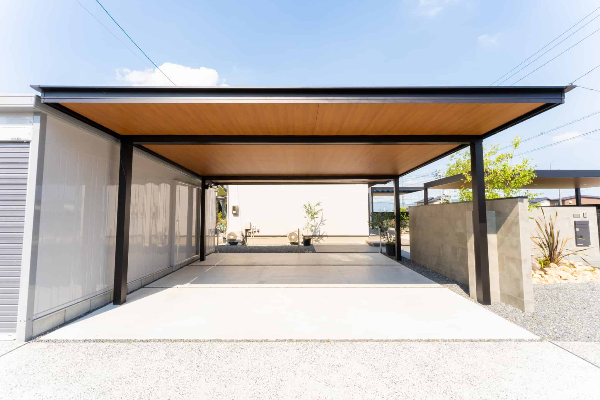 YKKAPの商品であるカーポートやリレーリアなど、フラット型で木目調の軒天のものを使用し、住宅との統一感を意識しました。