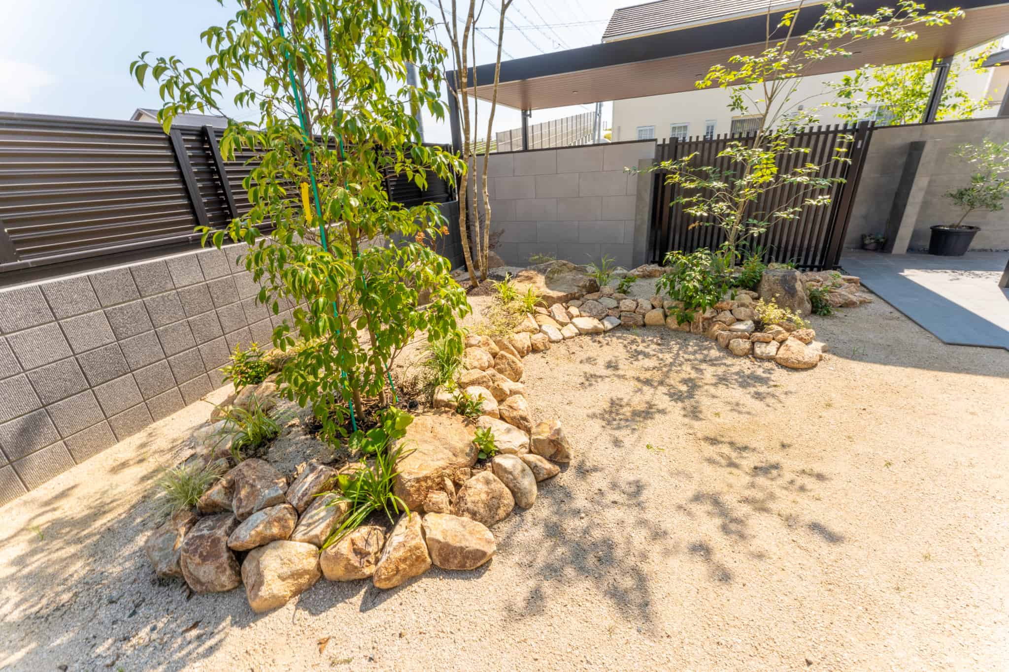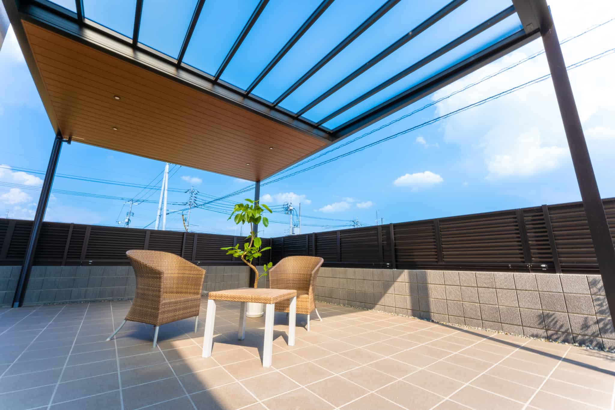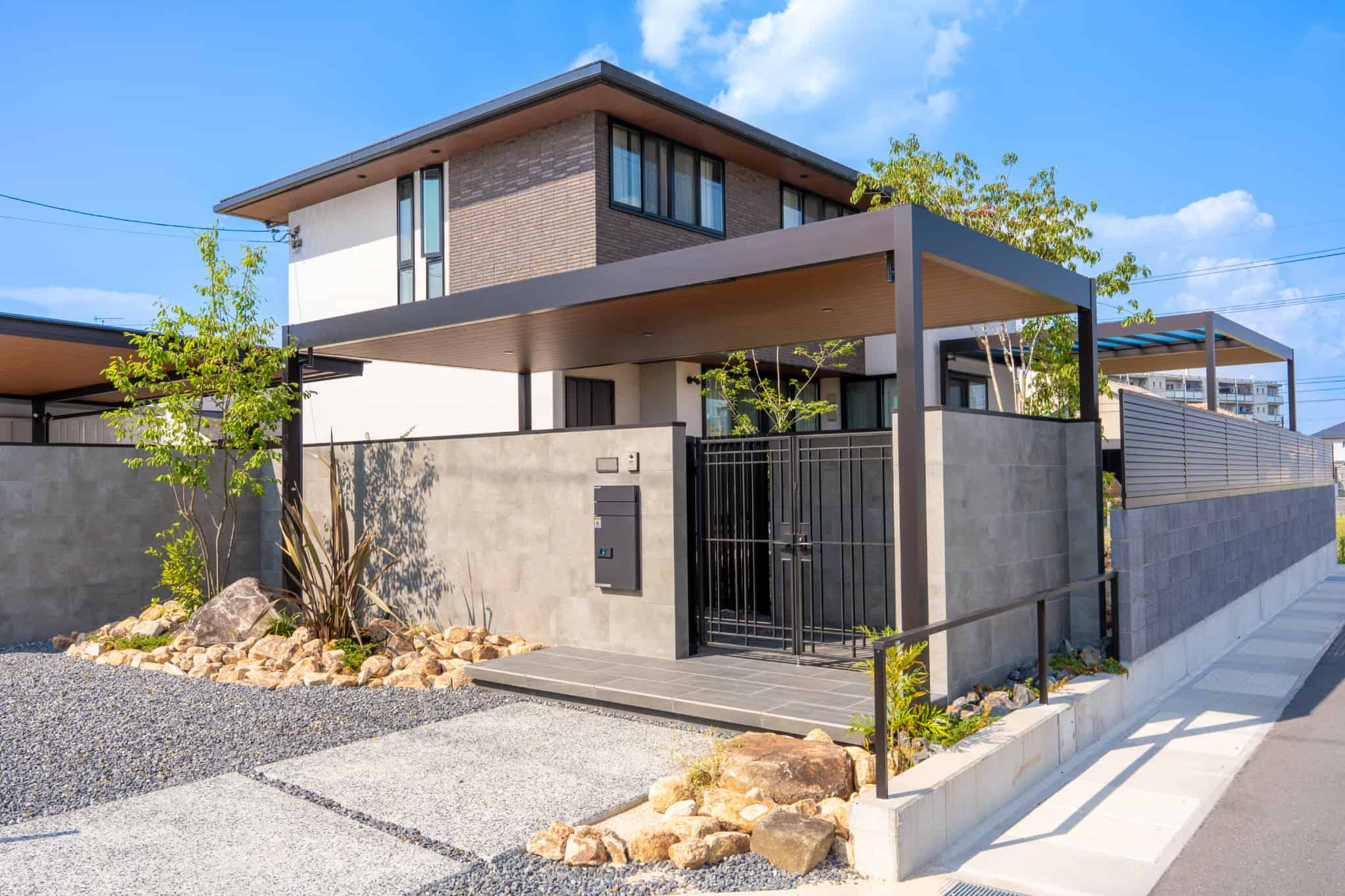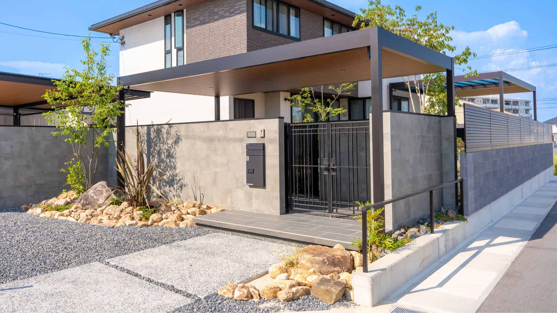 YKKAPの商品であるカーポートやリレーリアなど、フラット型で木目調の軒天のものを使用し、住宅との統一感を意識しました。