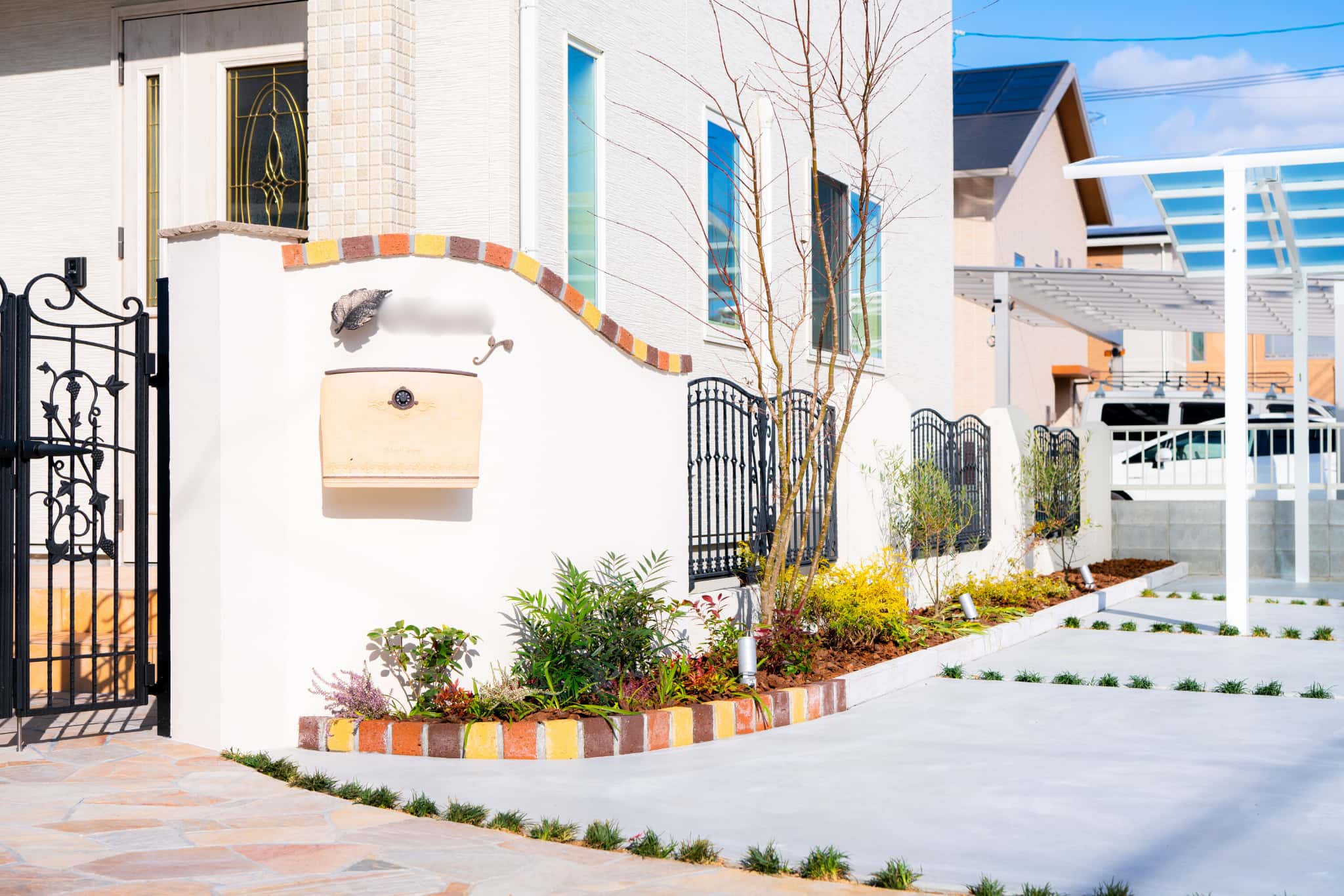 玄関アプローチは、ヨーロッパの街並みを想像させるオレンジの乱張りとレンガ花壇を使用し、温かみと上品さが感じられるエントランスになりました。