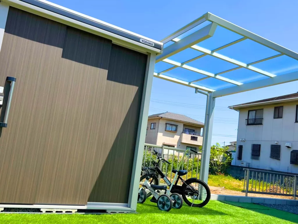 サイクルポートとしては、三協アルミのセルフィ(色:サンシルバー)を使用し、熱に強く快適な空間を提供。