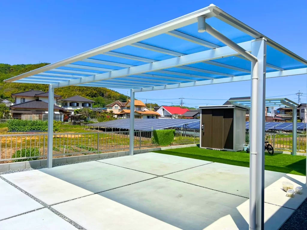 カーポートは三協アルミのスカイリード(色:サンシルバー)を使用し、前下がりの奥行勾配で車の駐車にゆとりを持たせ、室内からの見栄えも考慮されています。