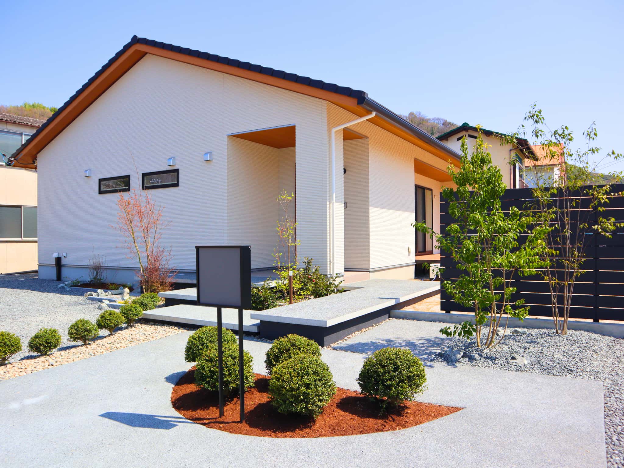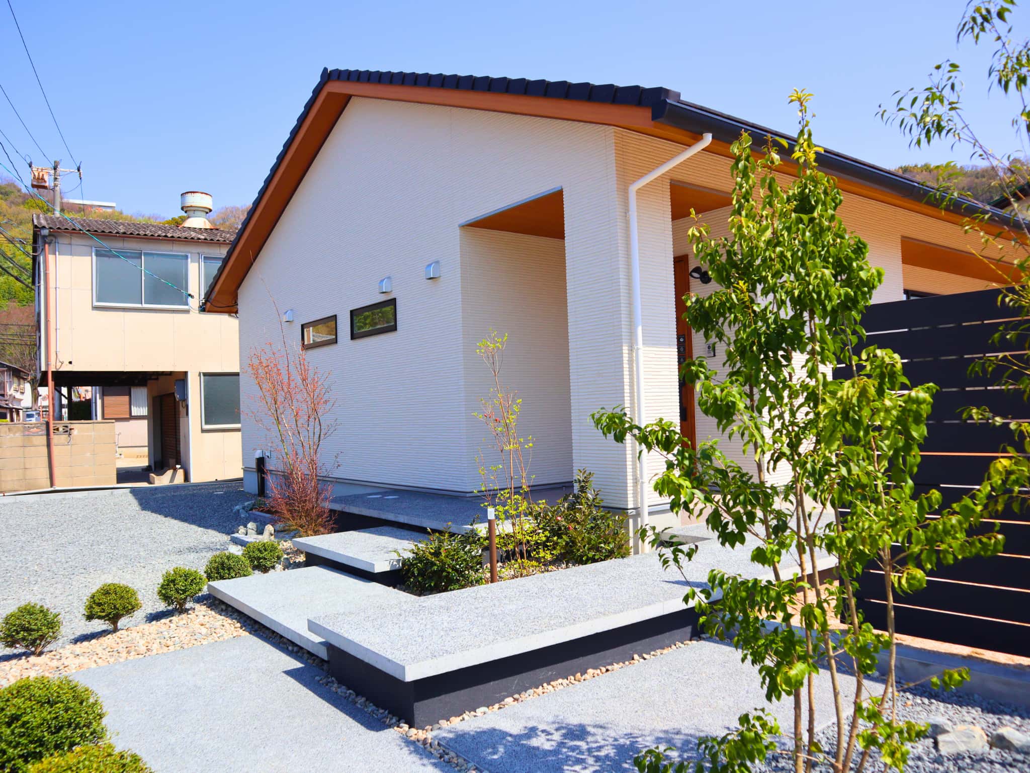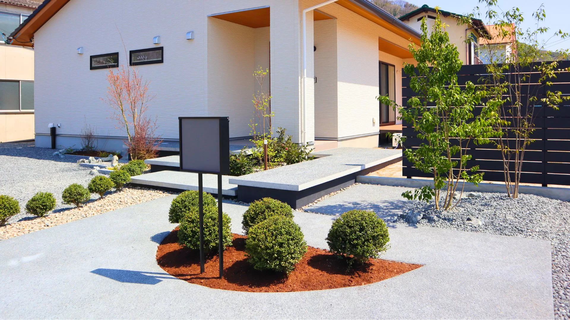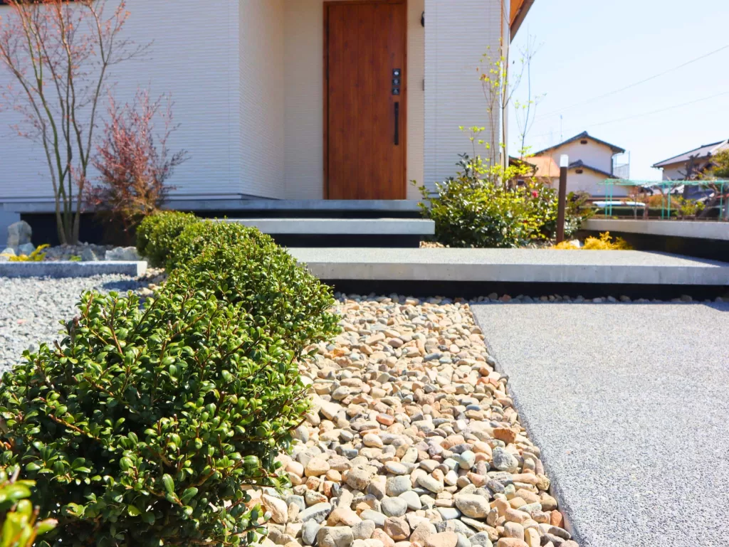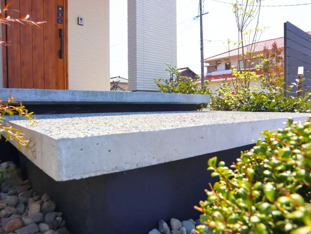 植栽や洗い出しコンクリートで和の趣を感じさせつつ、直線的な浮き階段とシックグレーの目隠しフェンスが現代的な印象を与えます。