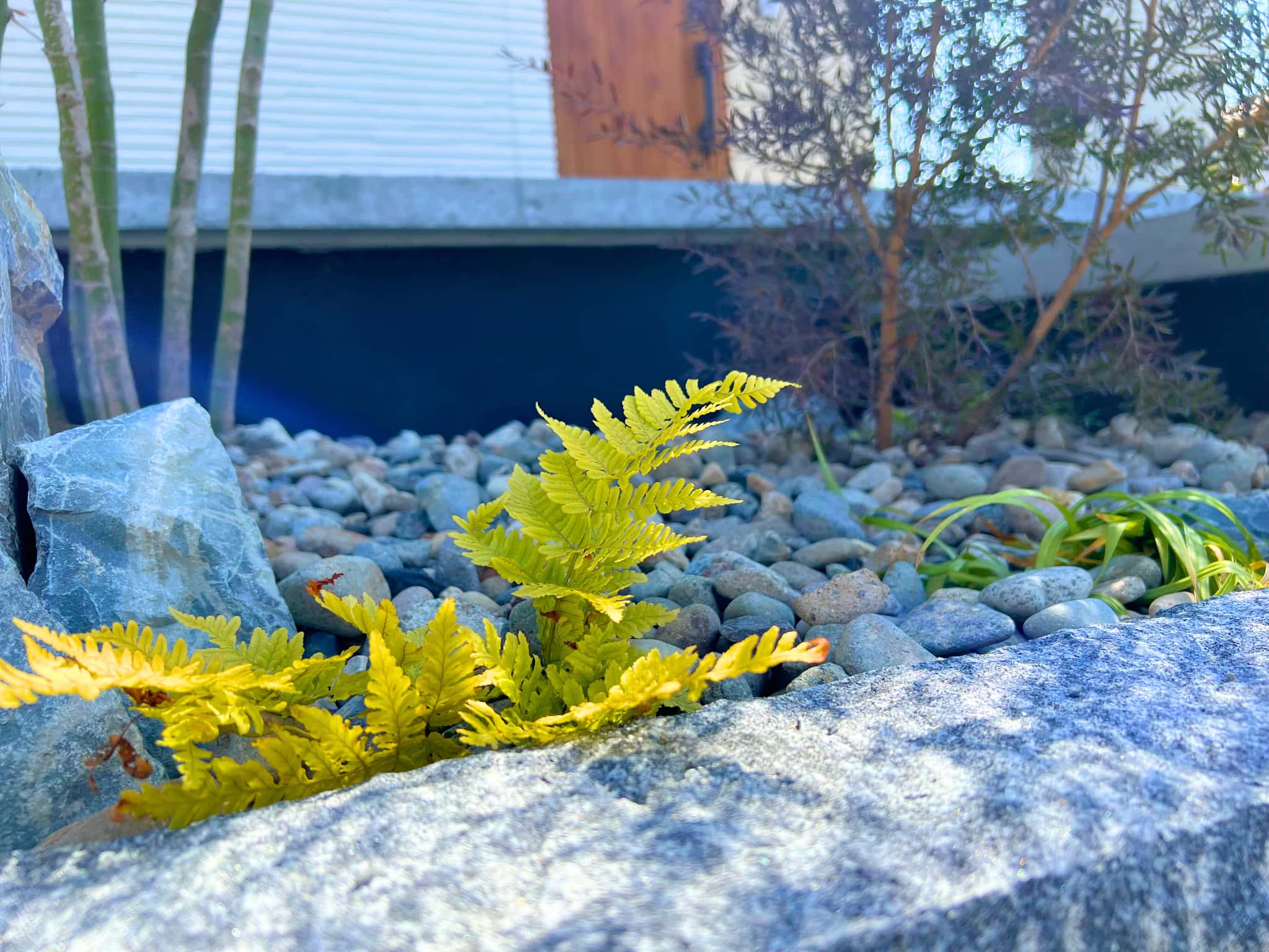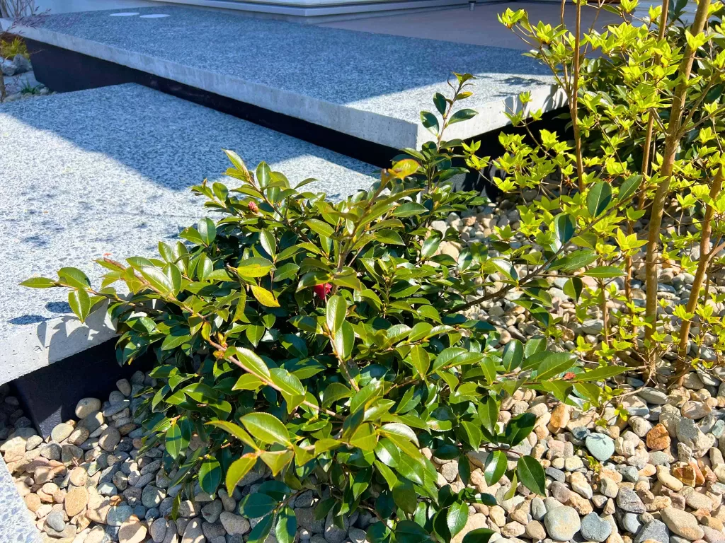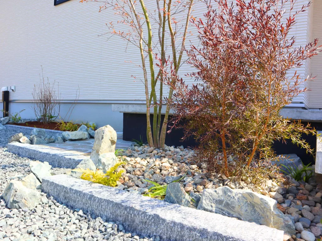 植栽はマメツゲやハイノキ、ソヨゴなどを用い、庭園には4種類の石を配置。