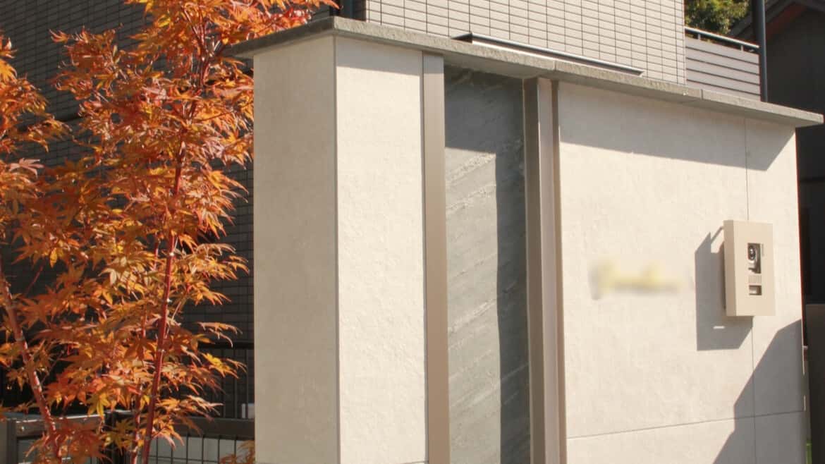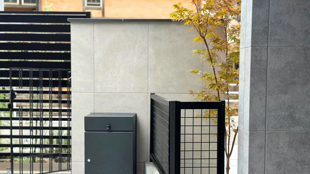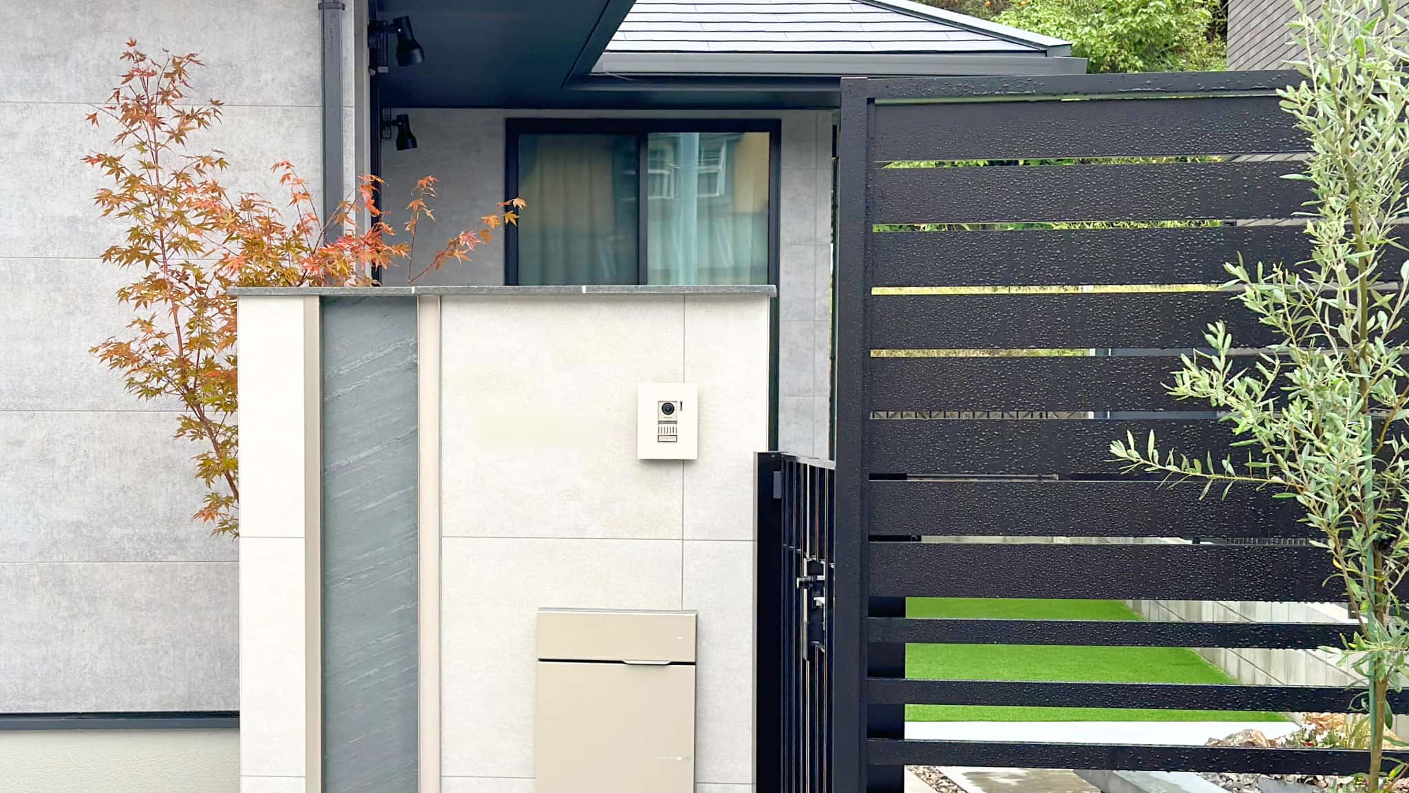 門柱には落ち着きのあるグレー系のタイルが使用され、石材のような風合いが空間に深みを与えています。