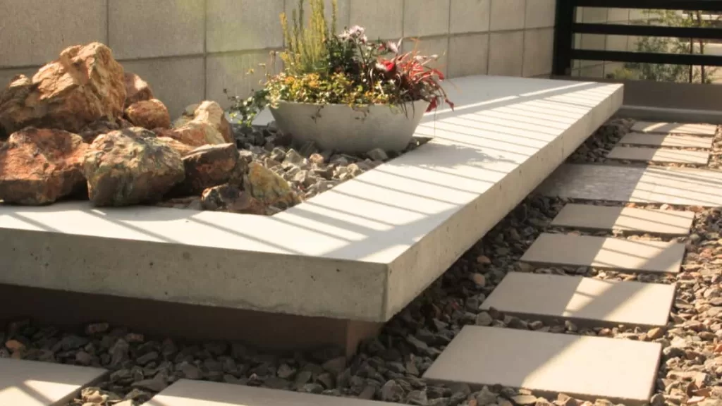 植栽ステージには鉢植えが置かれ、足元を彩るロックガーデンと共に、自然の豊かさを演出します。