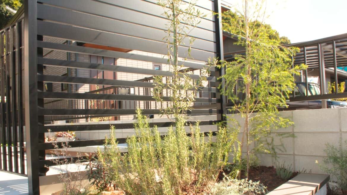 横スリットのブラックルーバーフェンスは、直線美を強調しつつ、プライバシーを守る機能性も兼ね備えています。