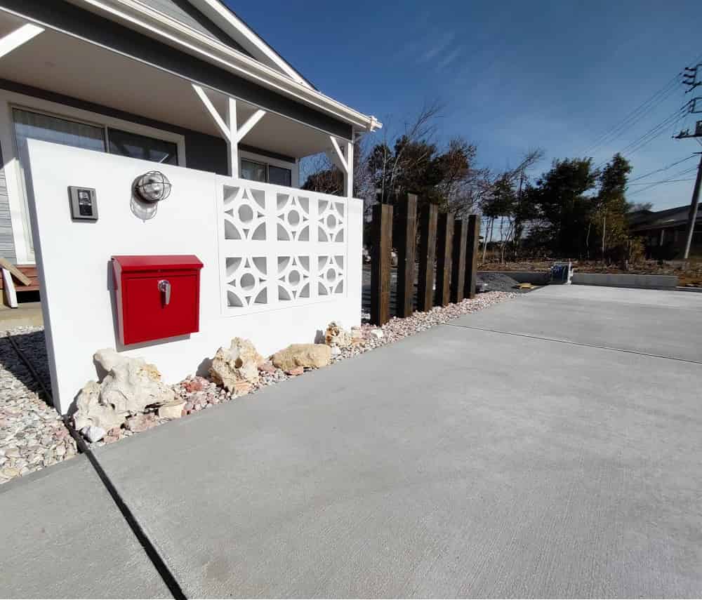 花ブロックの門柱にはウォールライトと赤いポストを設置し、おしゃれ度を高めました。