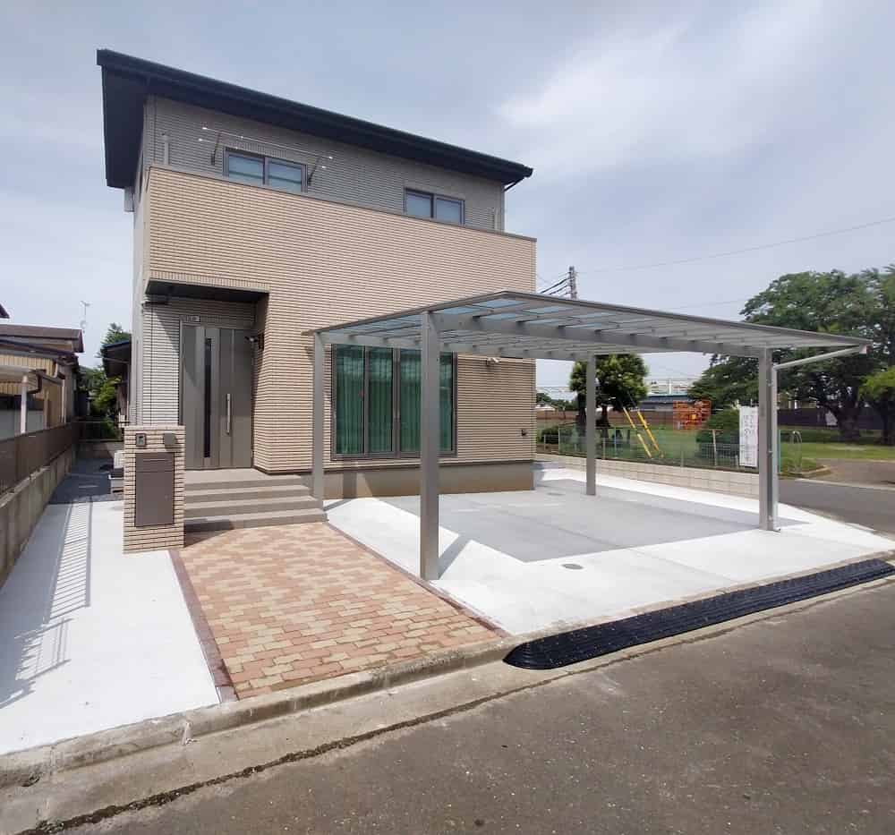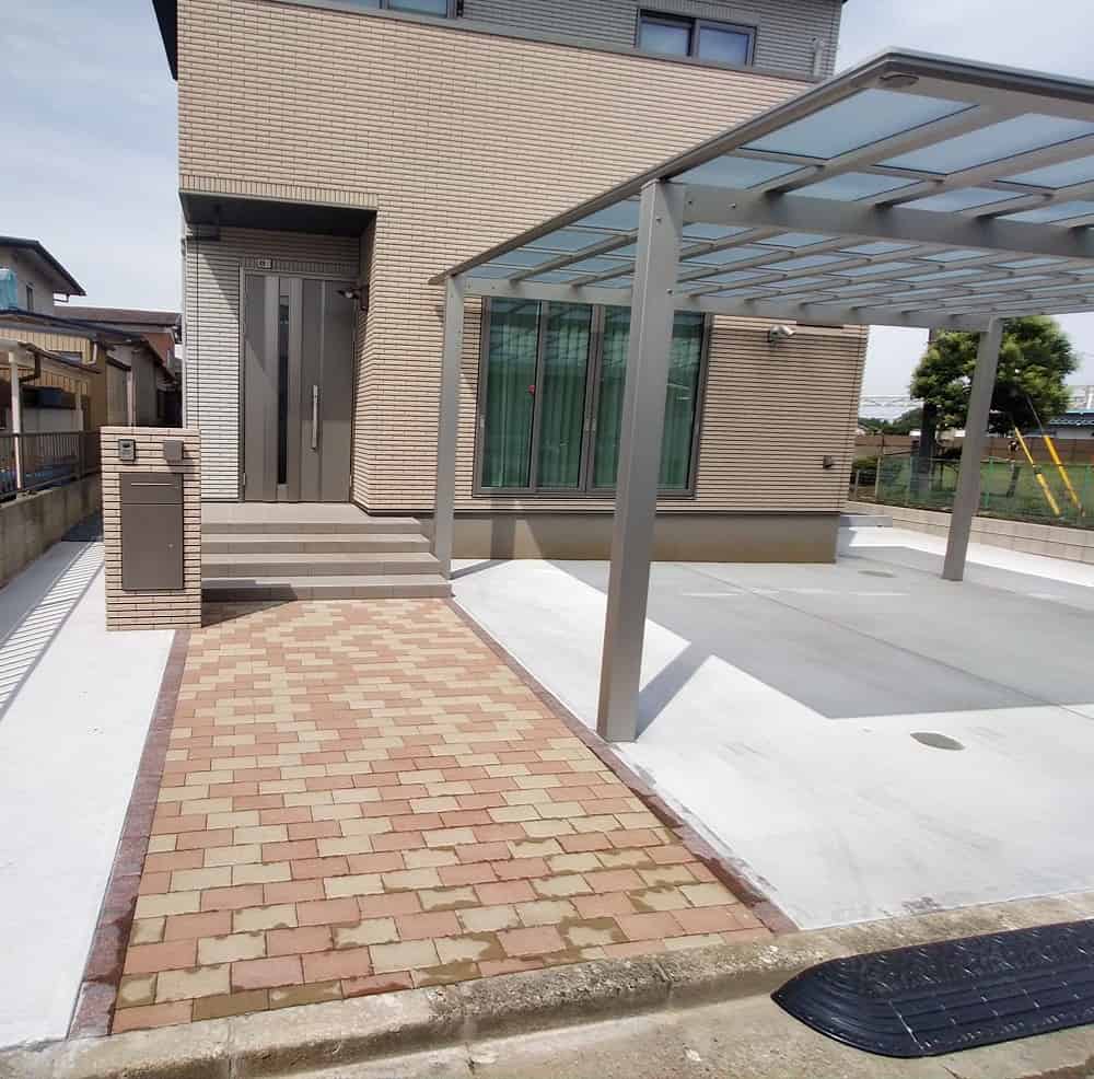 お客様のご要望は、駐車場2台分とカーポートの施工、施主様支給品のタイル門柱の設置、外観にマッチしたインターロッキングのアプローチの提案、そして既存の境界ブロックへのフェンス設置でした。