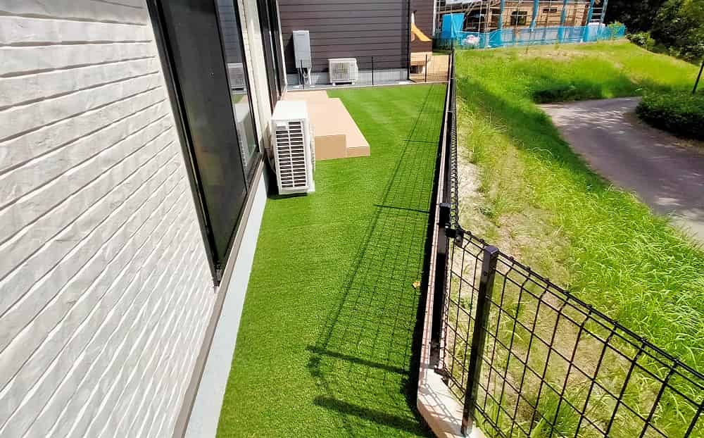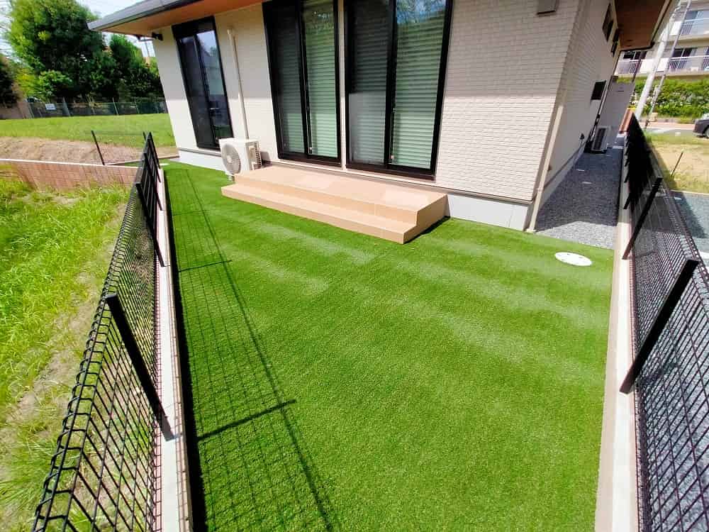 お客様のご要望は、ベージュ系のかわいいアプローチ(キャラクター入り)、人工芝のお庭、6号砕石の通路、そしてハウスメーカー施工済みのフェンスと同じものを庭側にも設置することでした。