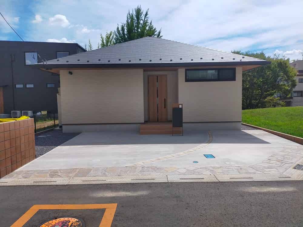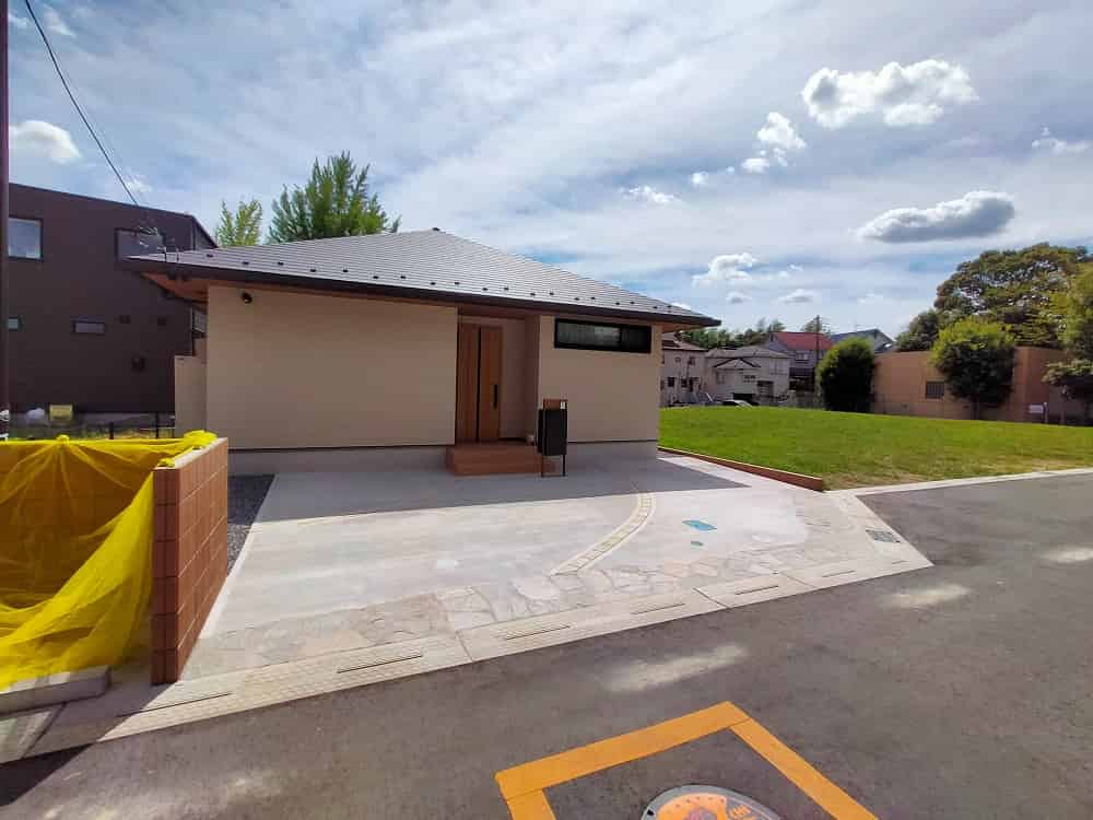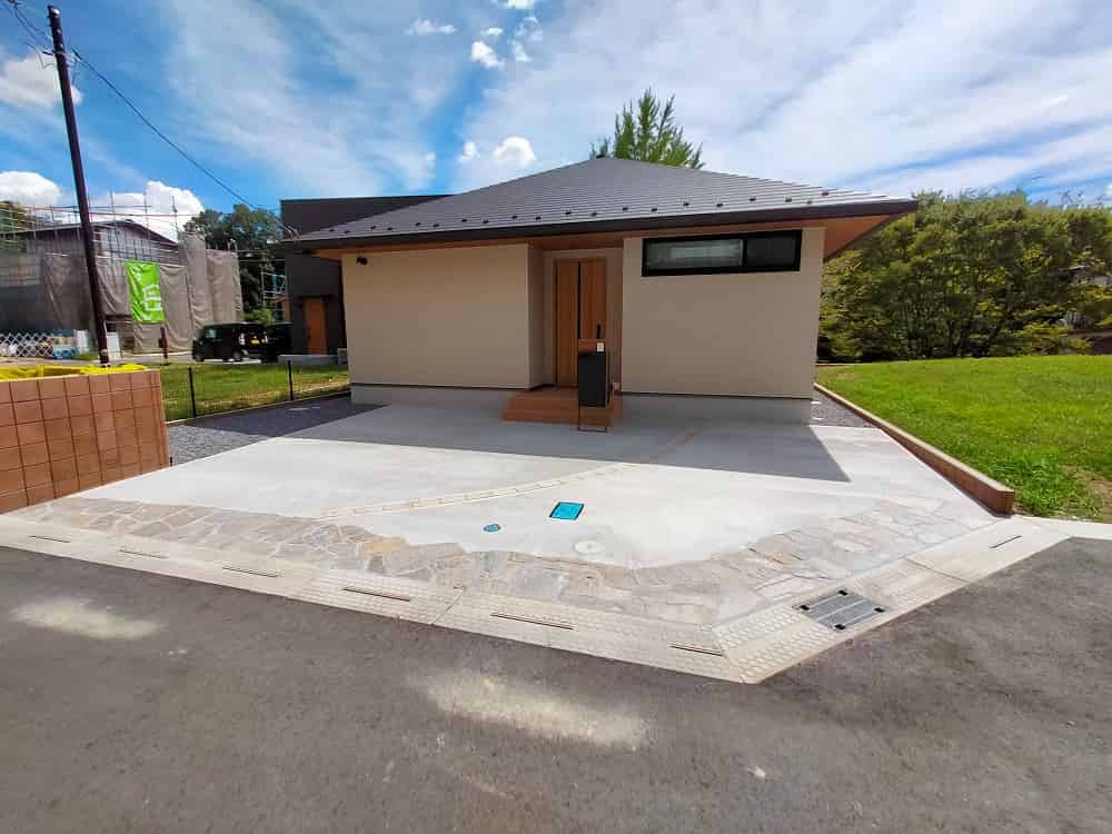 これらのご要望に対し、外観に合わせてアプローチもベージュ系で統一し、土間コンクリートには石貼りのアクセントを加えました。