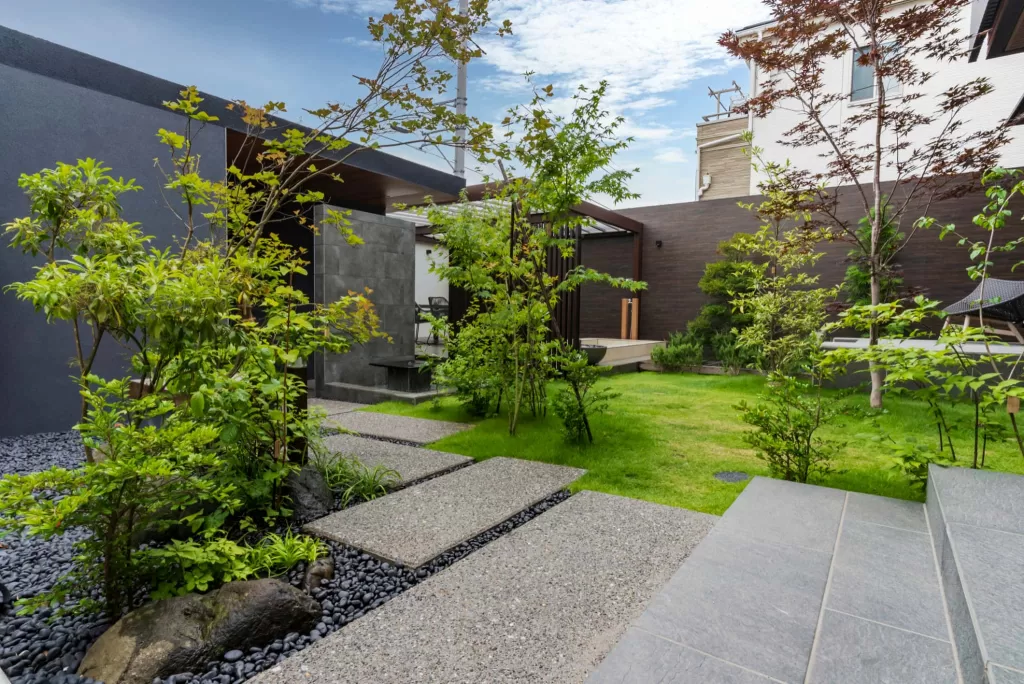 おしゃれなクローズ外構の壁は、グランアートウォールで囲まれており、プライベートな空間を確保。