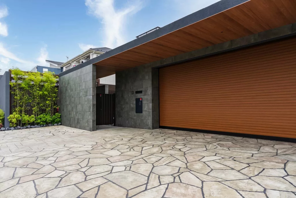 壁は、ガレージのシャッターの色とマッチしたグレーのタイルを使用。木目調のシャッターとの組み合わせが、上品で洗練された印象を与えます。