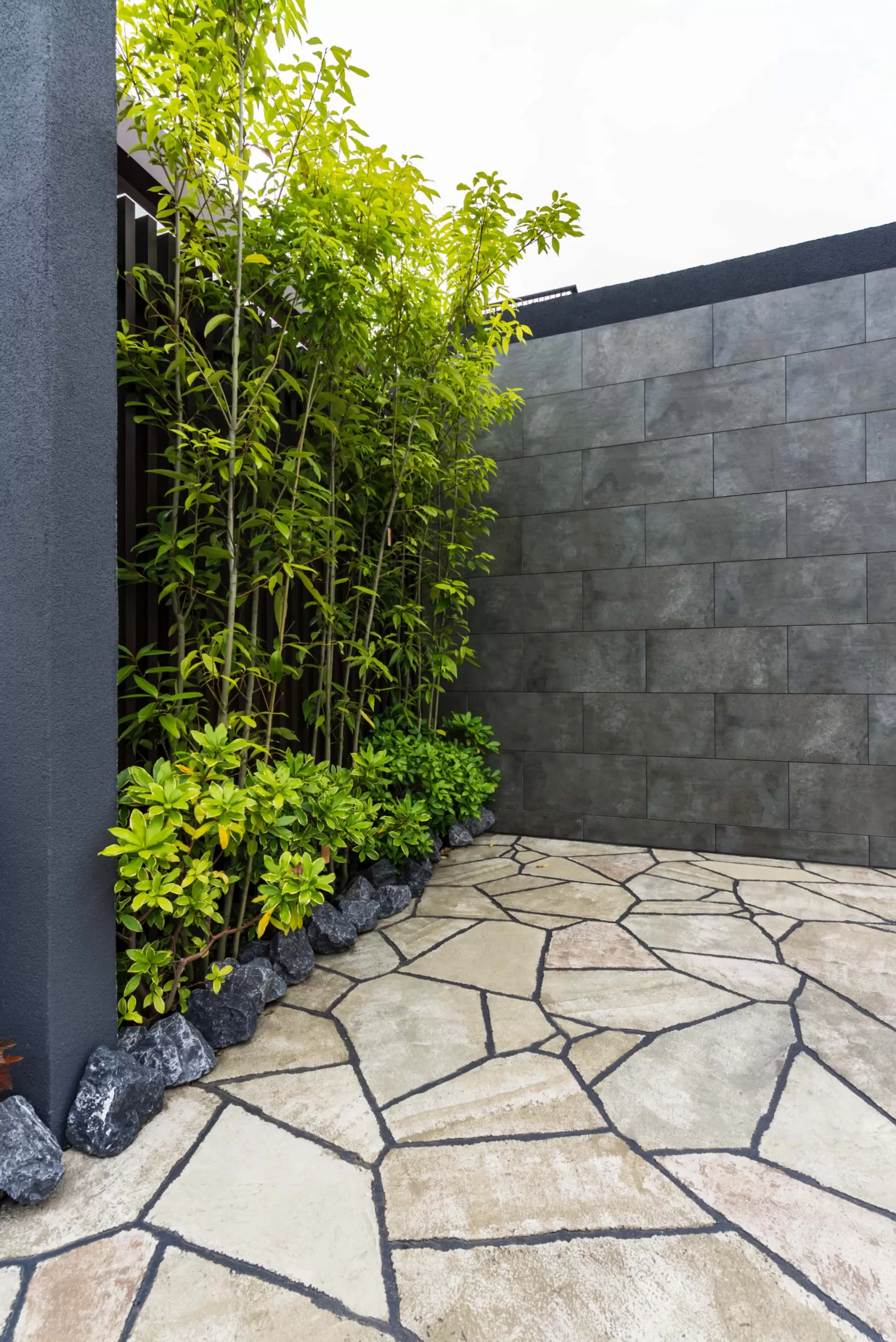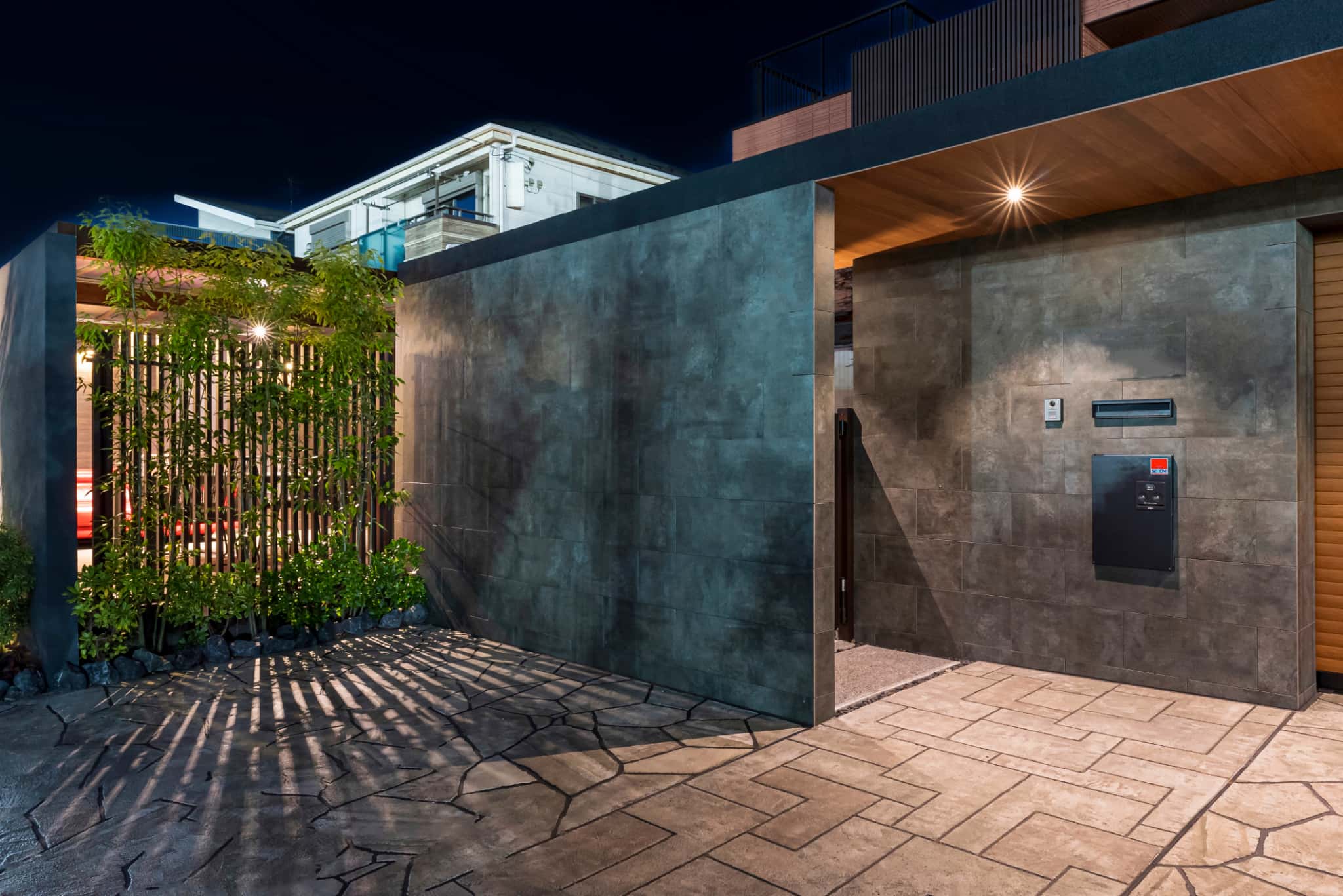 おしゃれなクローズ外構の壁は、グランアートウォールで囲まれており、プライベートな空間を確保。