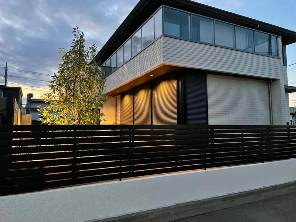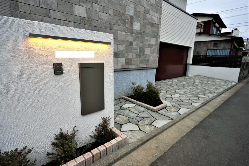 そこには宅配ボックスが埋め込まれていて、表札はライトで照らされています。
