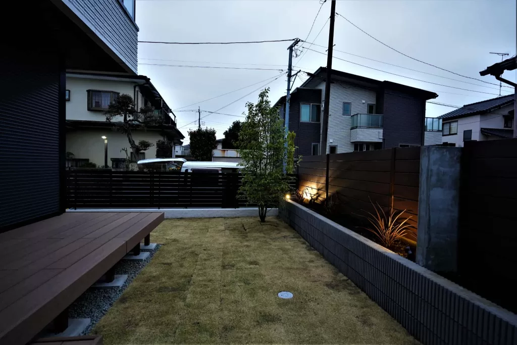 さらに、LIXIL製の両開き門扉を通り抜けると、プライベートな庭が広がり、大きなウッドデッキがリビングから続いています。