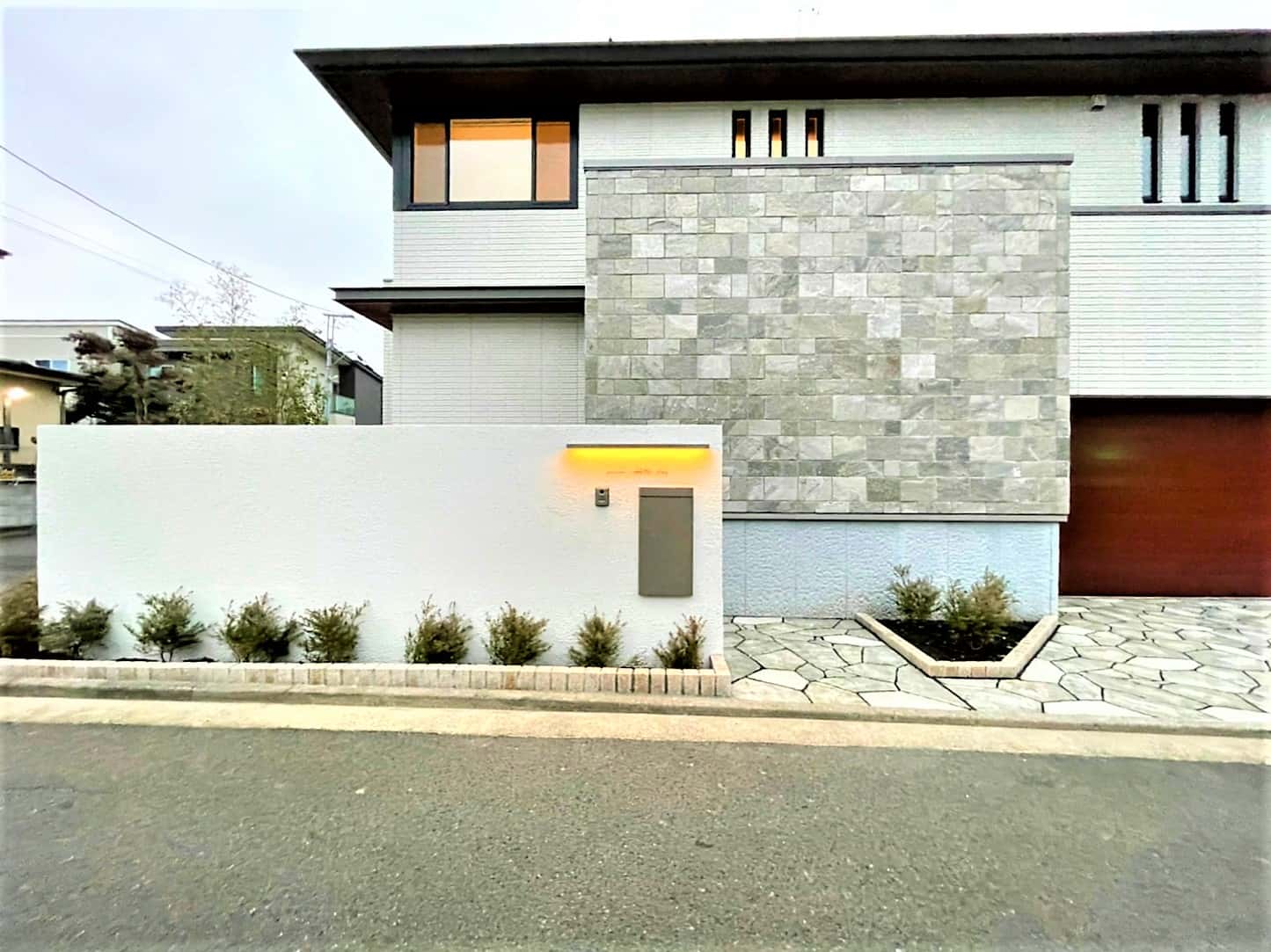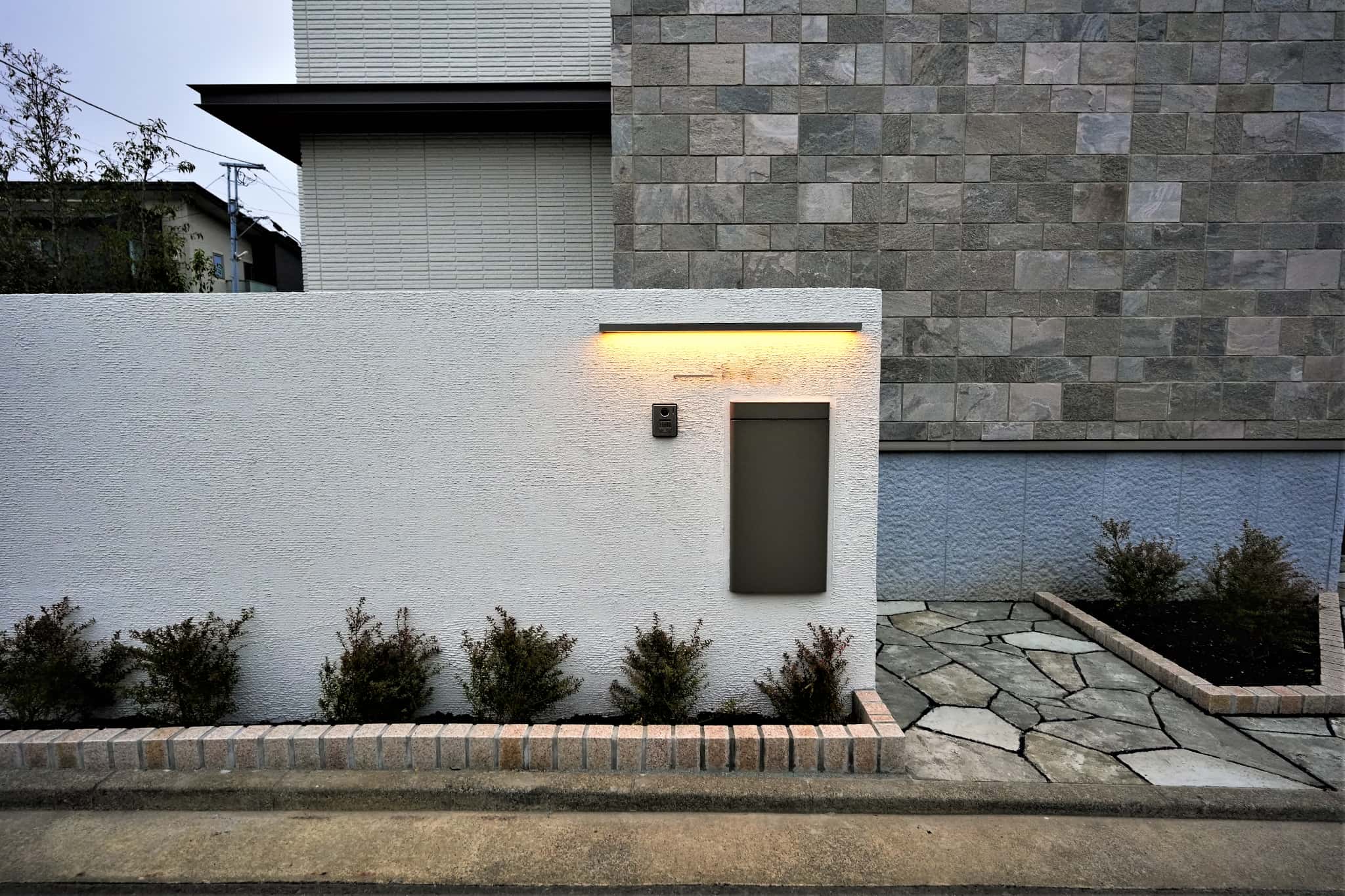 そこには宅配ボックスが埋め込まれていて、表札はライトで照らされています。