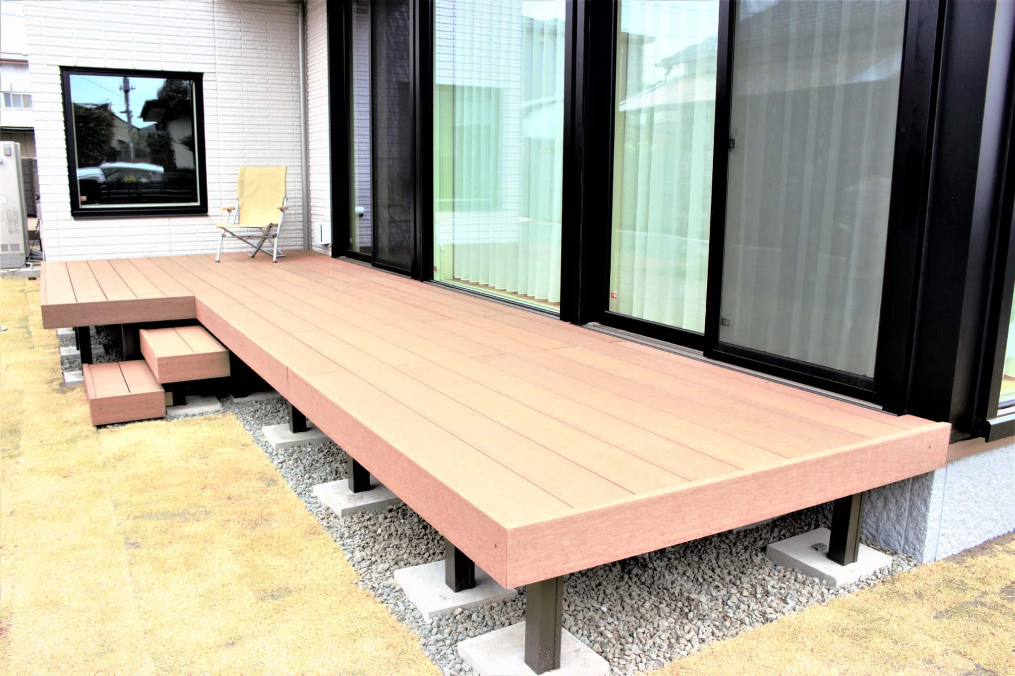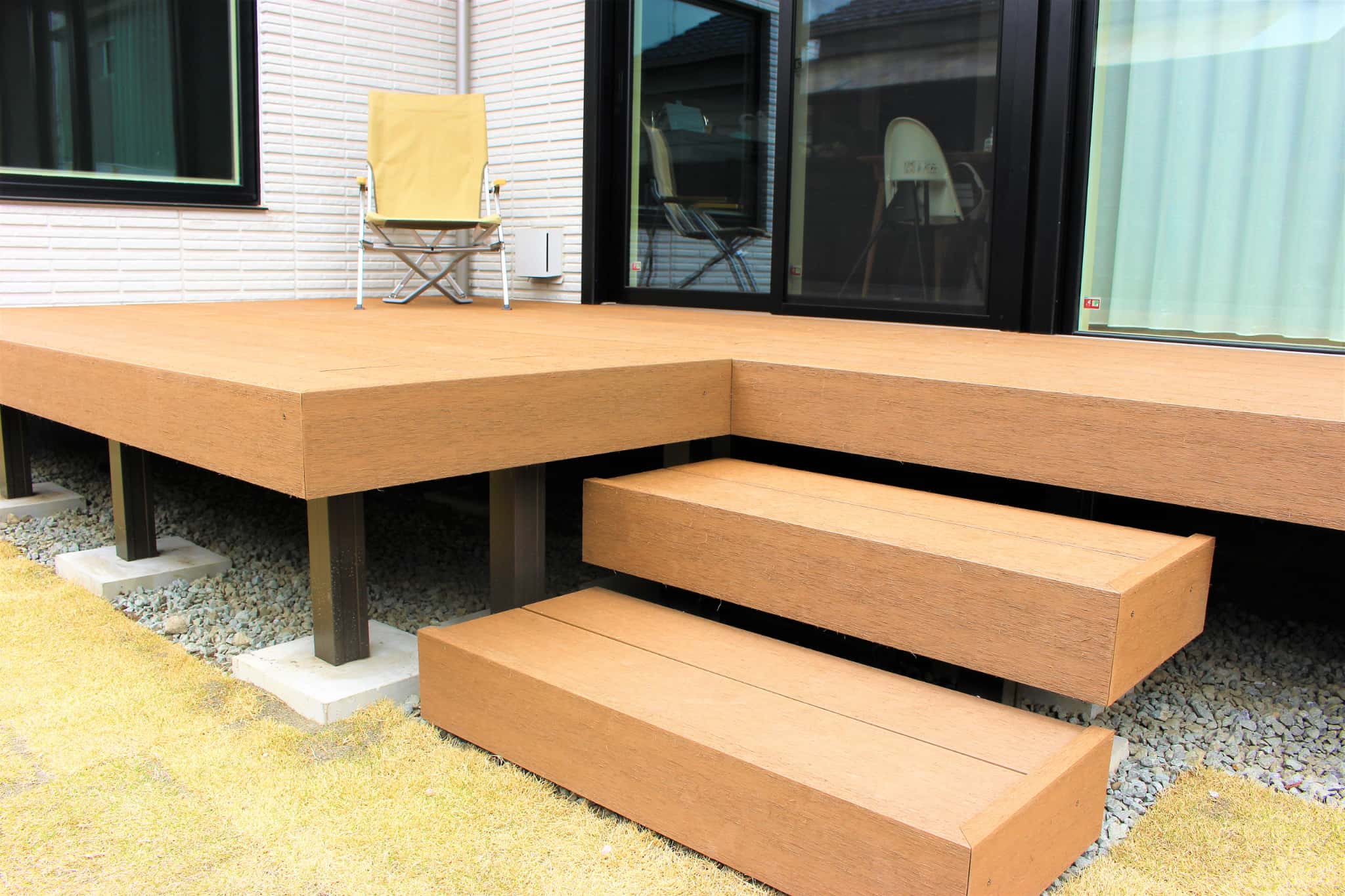 さらに、LIXIL製の両開き門扉を通り抜けると、プライベートな庭が広がり、大きなウッドデッキがリビングから続いています。