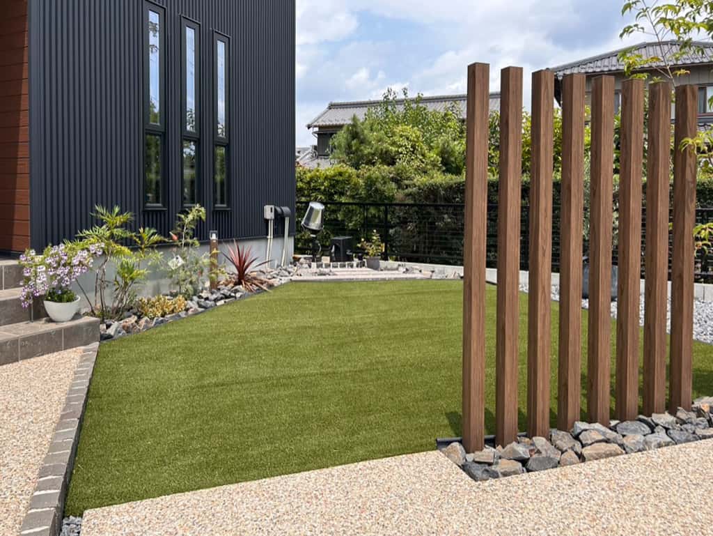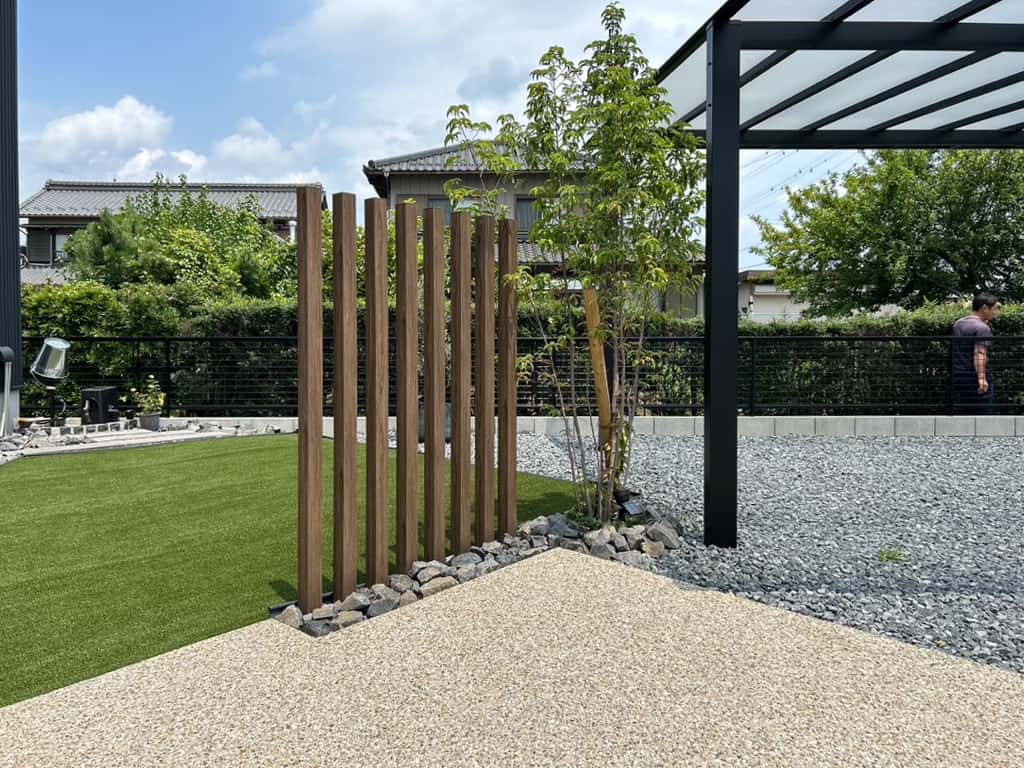 格子材を上手に使って適度なクローズ感。その後ろは家族だけのカフェの屋外席のような・・・
