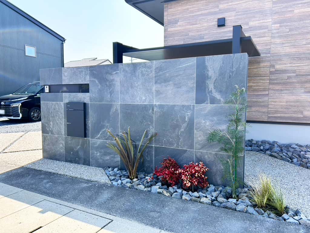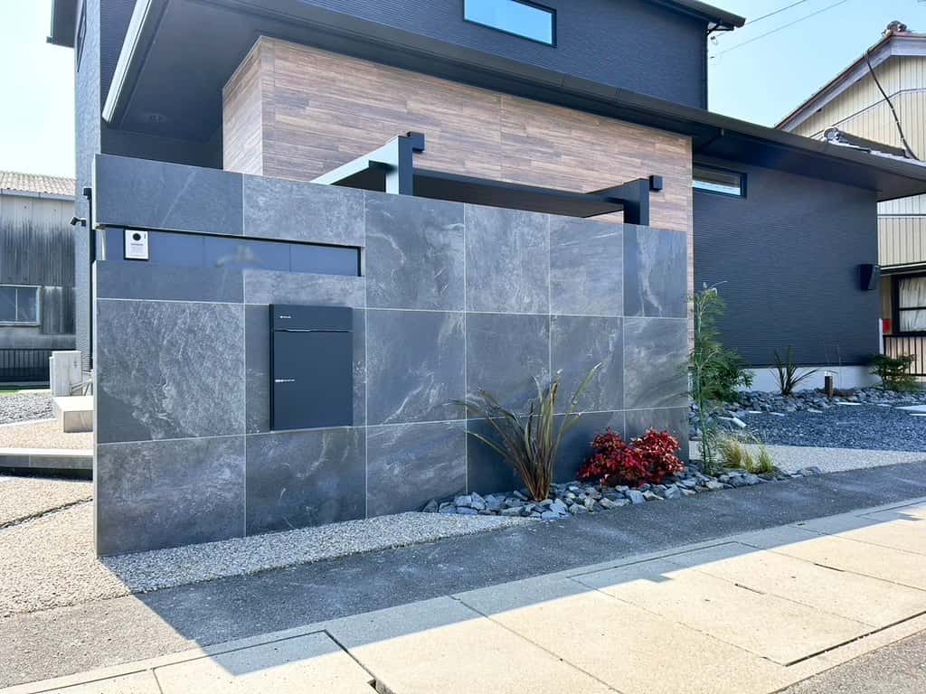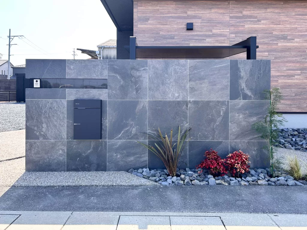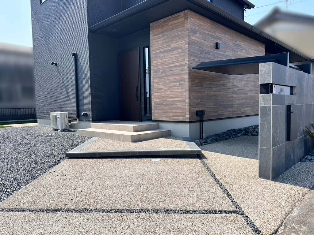 600角のライムストーン風タイルをつかった都会的な高級感ある外構