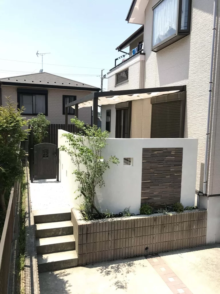 駐車場からお庭に抜けるアプローチに飾り塀をつくることで、テラスとの空間を分け、周りからの視界を気にすることなくテラスでくつろげます。